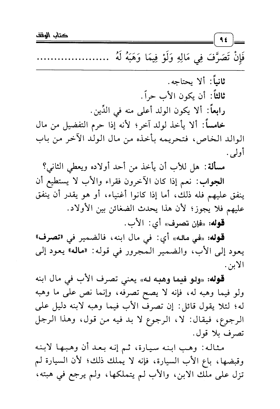 قوله: «ولو فيما وهبه له» يعني تصرف الأب في مال ابنه ولو فيما وهبه له، فإنه لا يصح تصرفه، وإنما نص على ما وهبه له؛ لئلا يقول قائل: إن تصرف الأب فيما وهبه لابنه دليل على الرجوع، فيقال: لا، الرجوع لا بد فيه من قول، وهذا الرجل تصرف بلا قول.