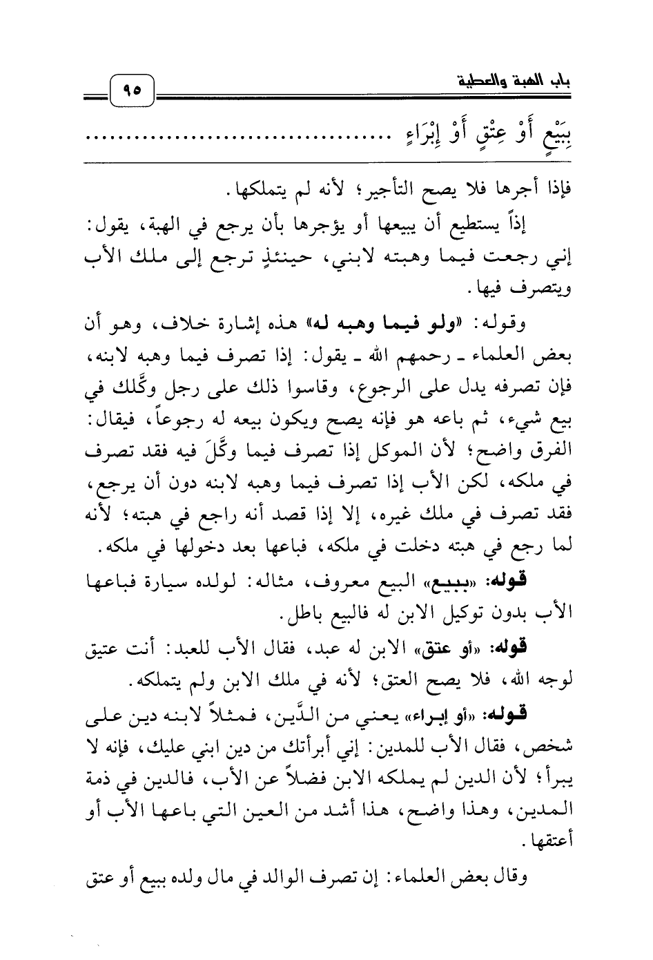 قوله: «أو إبراء» يعني من الدَّين، فمثلاً لابنه دين على شخص، فقال الأب للمدين: إني أبرأتك من دين ابني عليك، فإنه لا يبرأ؛ لأن الدين لم يملكه الابن فضلاً عن الأب، فالدين في ذمة المدين، وهذا واضح، هذا أشد من العين التي باعها الأب أو أعتقها.