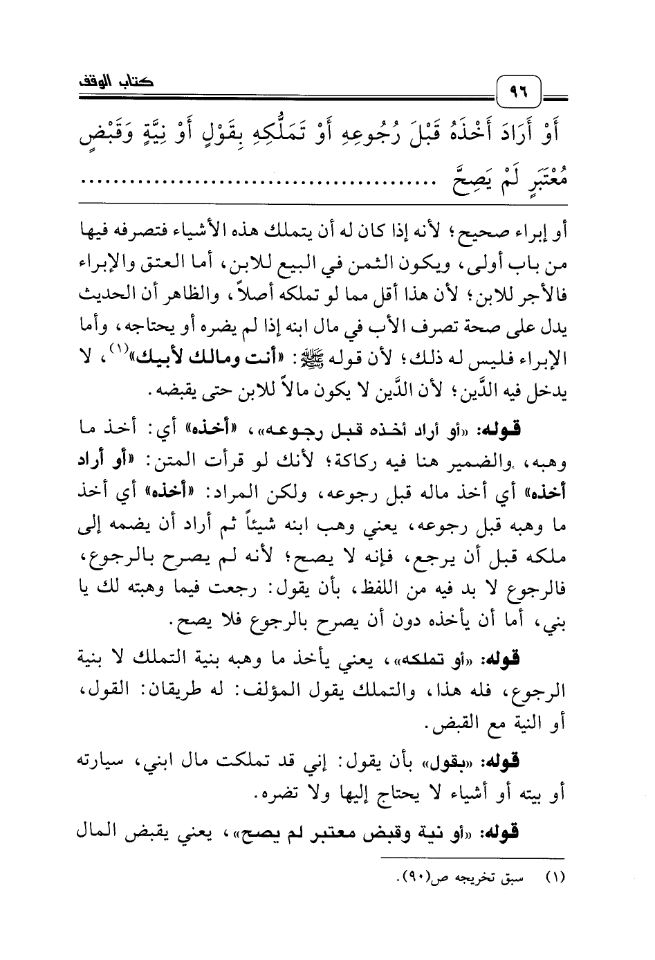 قوله: «أو أراد أخذه قبل رجوعه»، «أخذه» أي: أخذ ما وهبه، والضمير هنا فيه ركاكة؛ لأنك لو قرأت المتن: «أو أراد أخذه» أي أخذ ماله قبل رجوعه، ولكن المراد: «أخذه» أي أخذ ما وهبه قبل رجوعه، يعني وهب ابنه شيئاً ثم أراد أن يضمه إلى ملكه قبل أن يرجع، فإنه لا يصح؛ لأنه لم يصرح بالرجوع، فالرجوع لا بد فيه من اللفظ، بأن يقول: رجعت فيما وهبته لك يا بني، أما أن يأخذه دون أن يصرح بالرجوع فلا يصح.