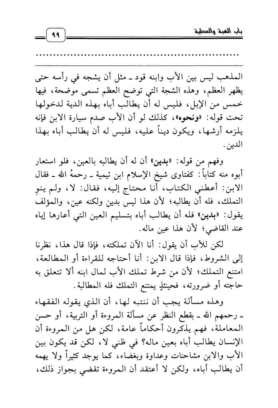 وهذه مسألة يجب أن ننتبه لها، أن الذي يقوله الفقهاء ـ رحمهم الله ـ بقطع النظر عن مسألة المروءة أو التربية، أو حسن المعاملة، فهم يذكرون أحكاماً عامة، لكن هل من المروءة أن الإنسان يطالب أباه بعين ماله؟ في ظني لا، لكن قد يكون بين الأب والابن مشاحنات وعداوة وبغضاء، كما يوجد كثيراً ولا يهمه أن يطالب أباه، ولكن لا أعتقد أن المروءة تقضي بجواز ذلك،
