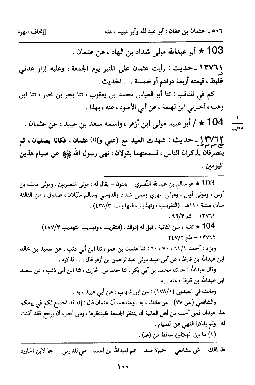13762 - حَدِيثٌ (طح حم عم ط ش) : شَهِدْتُ الْعِيدَ مَعَ عَلِيٍّ، وَعُثْمَانَ، فَكَانَا يُصَلِّيَانِ، ثُمَّ يَنْصَرِفَانِ يُذَكِّرَانِ النَّاسِ، فَسَمِعْتُهُمَا يَقُولانِ: نَهَى رَسُولُ اللَّهِ، صَلَّى اللَّهُ عَلَيْهِ وَسَلَّمَ، عَنْ صِيَامِ هَذَيْنِ الْيَوْمَيْنِ.