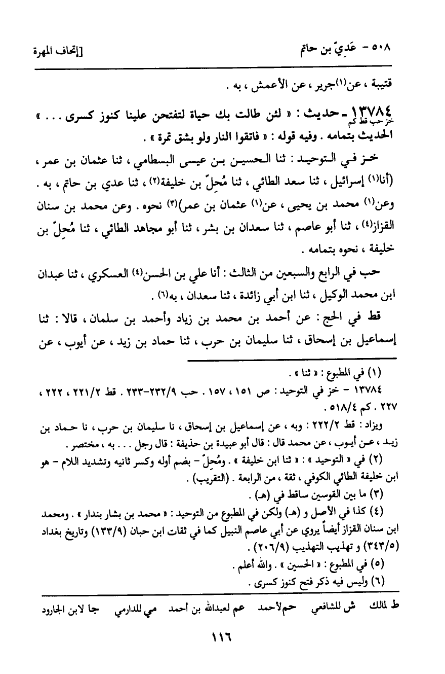 خز فِي التَّوْحِيدِ: ثنا الْحُسَيْنُ بْنُ عِيسَى الْبِسْطَامِيُّ، ثنا عُثْمَانُ بْنُ عُمَرَ، أنا إِسْرَائِيلُ، ثنا سَعْدٌ الطَّائِيُّ، ثنا مُحِلُّ بْنُ خَلِيفَةَ، ثنا عَدِيُّ بْنُ حَاتِمٍ، بِهِ. وَعَنْ مُحَمَّدِ بْنِ يَحْيَى، عَنْ عُثْمَانَ بْنِ عُمَرَ، نَحْوَهُ. وَعَنْ مُحَمَّدِ بْنِ سِنَانٍ الْقَزَّازِ، ثنا أَبُو عَاصِمٍ، ثنا سَعْدَانُ بْنُ بِشْرٍ، ثنا أَبُو مُجَاهِدٍ الطَّائِيُّ، ثنا مُحِلُّ بْنُ خَلِيفَةَ، نَحْوَهُ بِتَمَامِهِ.