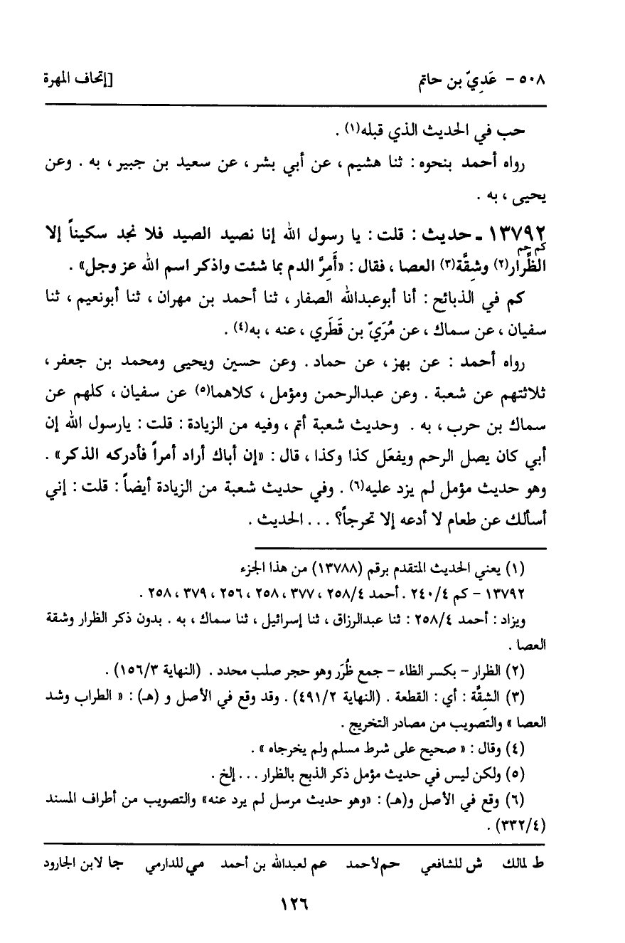 رَوَاهُ أَحْمَدُ: عَنْ بَهْزٍ، عَنْ حَمَّادٍ. وَعَنْ حُسَيْنٍ، وَيَحْيَى، وَمُحَمَّدِ بْنِ جَعْفَرٍ، ثَلاثَتُهُمْ عَنْ شُعْبَةَ. وَعَنْ عَبْدِ الرَّحْمَنِ، وَمُؤَمَّلٍ، كِلاهُمَا عَنْ سُفْيَانَ، كُلُّهُمْ عَنْ سِمَاكِ بْنِ حَرْبٍ، بِهِ. وَحَدِيثُ شُعْبَةَ أَتَمُّ، وَفِيهِ مِنَ الزِّيَادَةِ: قُلْتُ: يَا رَسُولَ اللَّهِ، إِنَّ أَبِي كَانَ يَصِلُ الرَّحِمَ وَيَفْعَلُ كَذَا وَكَذَا، قَالَ: " إِنَّ أَبَاكَ أَرَادَ أَمْرًا فَأَدْرَكَهُ الذِّكْرُ ". وَهُوَ حَدِيثُ مُؤَمَّلٍ لَمْ يَزِدْ عَلَيْهِ. وَفِي حَدِيثِ شُعْبَةَ مِنَ الزِّيَادَةِ أَيْضًا: قُلْتُ: إِنِّي أَسْأَلُكَ عَنْ طَعَامٍ لا أَدَعُهُ إِلا تَحَرُّجًا؟ ... الْحَدِيثَ.
