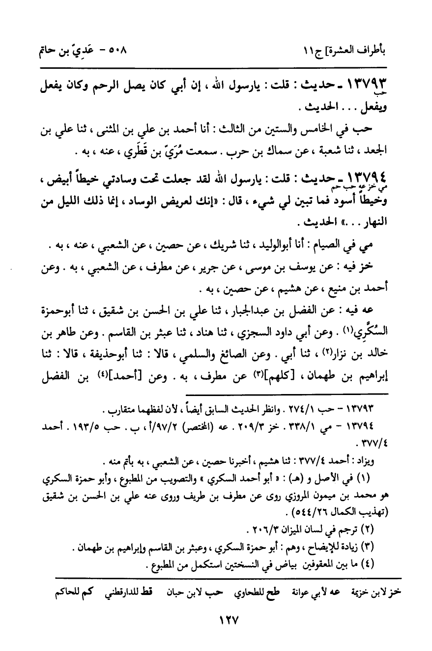 خز فِيهِ: عَنْ يُوسُفَ بْنِ مُوسَى، عَنْ جَرِيرٍ، عَنْ مُطَرِّفٍ، عَنِ الشَّعْبِيِّ، بِهِ. وَعَنْ أَحْمَدَ بْنِ مَنِيعٍ، عَنْ هُشَيْمٍ، عَنْ حُصَيْنٍ، بِهِ.