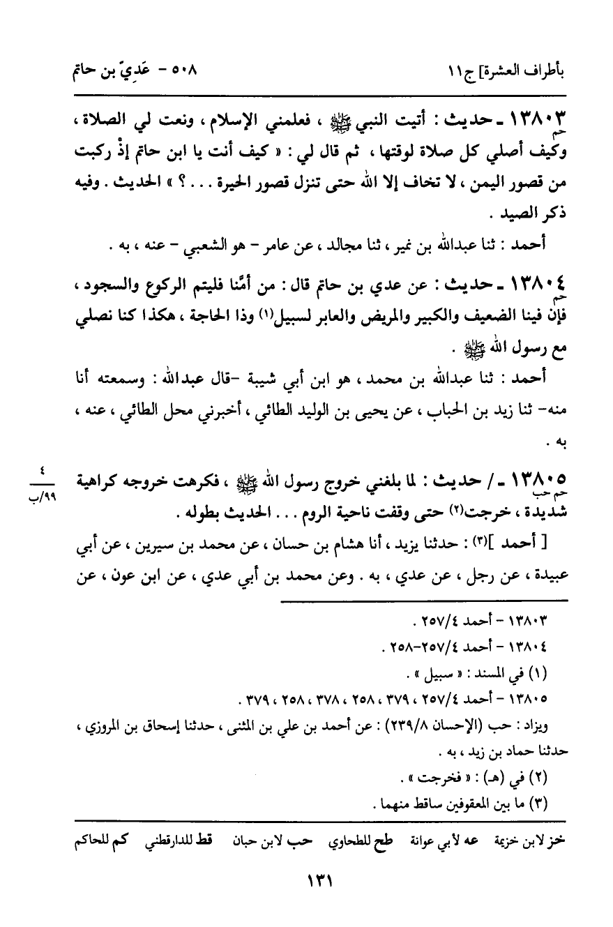 13803 - حَدِيثٌ (حم) : أَتَيْتُ النَّبِيَّ، صَلَّى اللَّهُ عَلَيْهِ وَسَلَّمَ، فَعَلَّمَنِي الإِسْلامَ، وَنَعَتَ لِيَ الصَّلاةَ، وَكَيْفَ أُصَلِّي كُلَّ صَلاةٍ لِوَقْتِهَا، ثُمَّ قَالَ لِي: " كَيْفَ أَنْتَ يَا ابْنَ حَاتِمٍ إِذْ رَكِبْتَ مِنْ قُصُورِ الْيَمَنِ، لا تَخَافُ إِلا اللَّهَ حَتَّى تَنْزِلَ قُصُورَ الْحِيرَةِ " ... ؟ الْحَدِيثَ. وَفِيهِ ذِكْرُ الصَّيْدِ.
