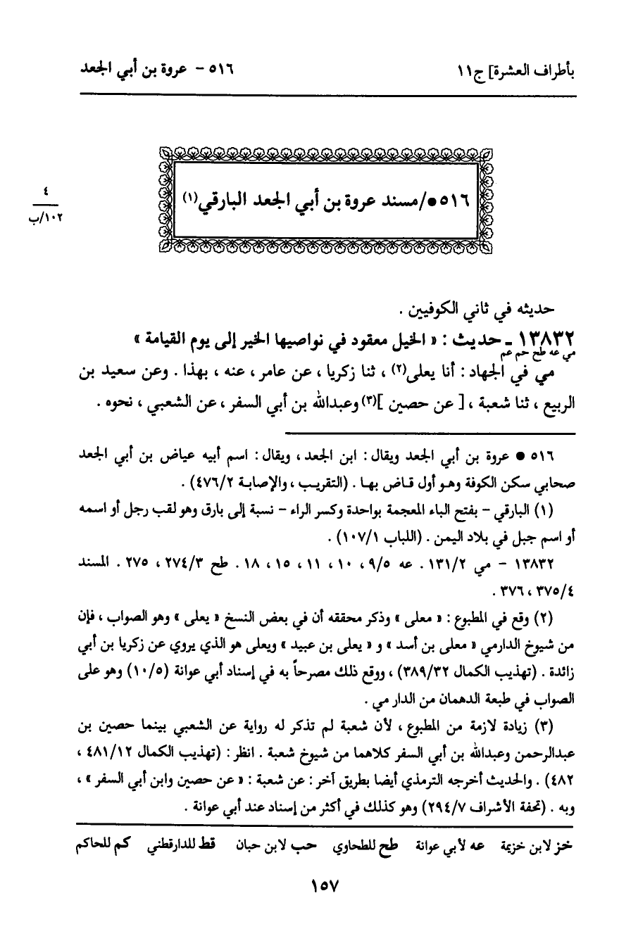 516 ـ مُسْنَدُ عُرْوَةَ بْنِ أَبِي الْجَعْدِ الْبَارِقِيِّ.