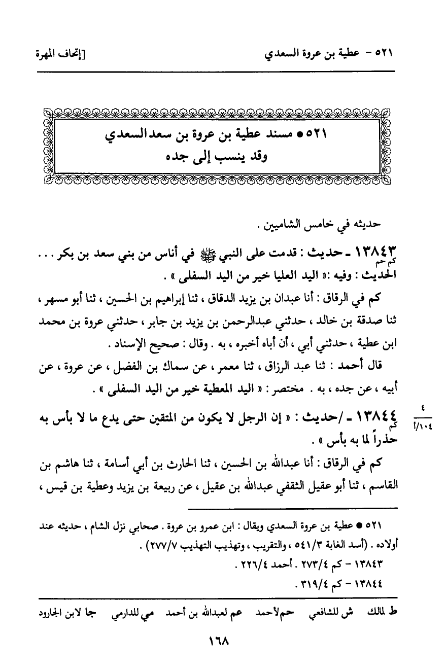 521 ـ مُسْنَدُ عَطِيَّةَ بْنِ عُرْوَةَ بْنِ سَعْدٍ السَّعْدِيِّ وَقَدْ يُنْسَبْ إِلَى جَدِّهِ.