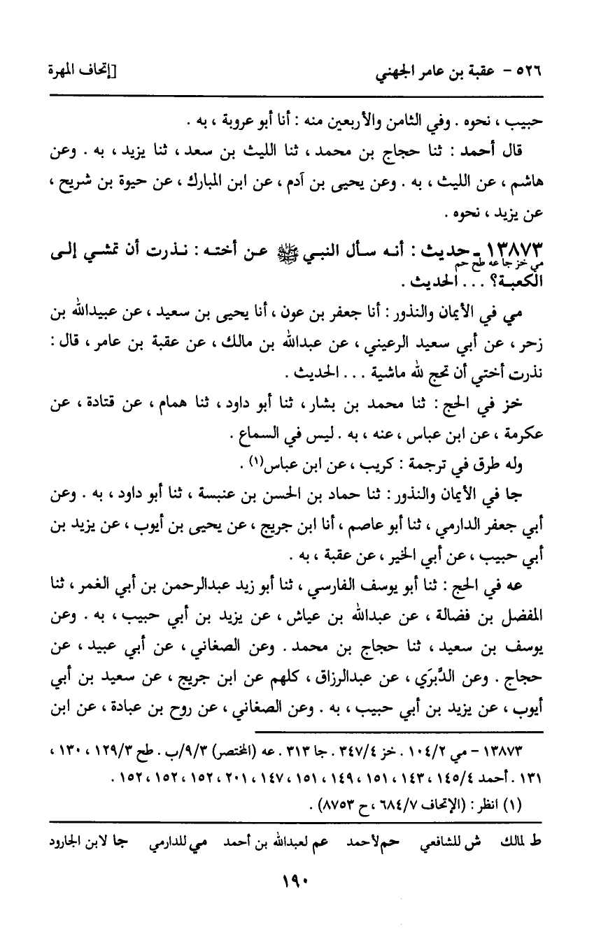13873 - حَدِيثٌ (مي خز جا عه طح حم) : أَنَّهُ سَأَلَ النَّبِيَّ، صَلَّى اللَّهُ عَلَيْهِ وَسَلَّمَ، عَنْ أُخْتِهِ: نَذَرَتْ أَنْ تَمْشِيَ إِلَى الْكَعْبَةِ؟ ... الْحَدِيثَ.