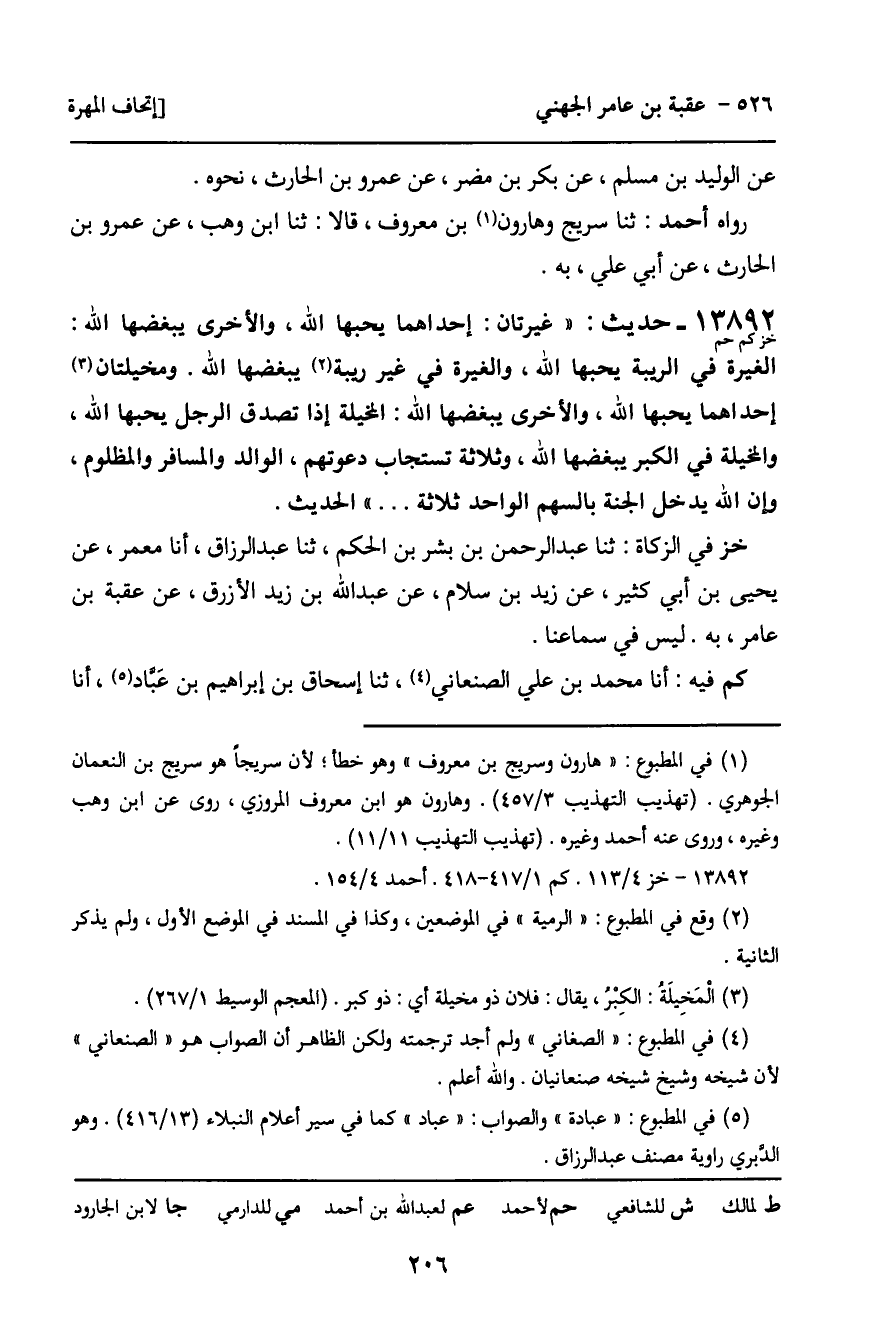 13892 - حَدِيثٌ (خز كم حم) : " غَيْرَتَانِ: إِحْدَاهُمَا يُحِبُّهَا اللَّهُ، وَالأُخْرَى يَبْغَضُهَا اللَّهُ: الْغَيْرَةُ فِي الرِّيبَةِ يُحِبُّهَا اللَّهُ، وَالْغَيْرَةُ فِي غَيْرِ رِيبَةٍ يَبْغَضُهَا اللَّهُ. وَمَخْيِلَتَانِ إِحْدَاهُمَا يُحِبُّهَا اللَّهُ، وَالأُخْرَى يَبْغَضُهَا اللَّهُ: الْمَخْيَلَةُ إِذَا تَصَدَّقَ الرَّجُلُ يُحِبُّهَا اللَّهُ، وَالْمَخْيَلَةُ فِي الْكِبْرِ يَبْغَضُهَا اللَّهُ، وَثَلاثَةٌ تُسْتَجَابُ دَعْوَتُهُمْ: الْوَالِدُ وَالْمُسَافِرُ وَالْمَظْلُومُ، وَإِنَّ اللَّهَ يُدْخِلُ الْجَنَّةَ بِالسَّهْمِ الْوَاحِدِ ثَلاثَةً " ... الْحَدِيثَ.