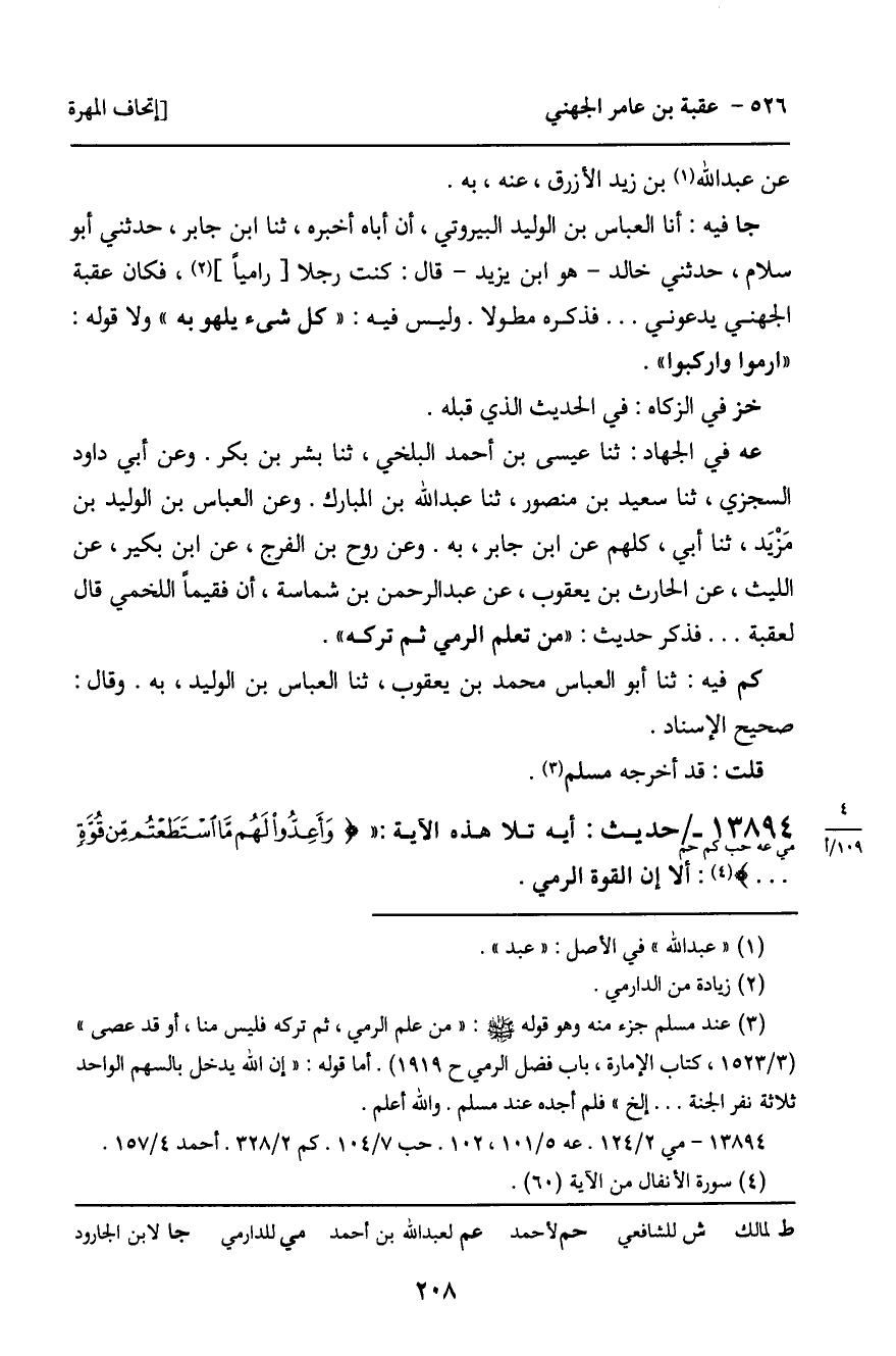 13894 - حَدِيثٌ (مي عه حب كم حم) : أَنَّهُ تَلا هَذِهِ الآيَةَ: وَأَعِدُّوا لَهُمْ مَا اسْتَطَعْتُمْ مِنْ قُوَّةٍ [سورة: الأنفال، آية 60] : أَلا إِنَّ الْقُوَّةَ الرَّمْيُ.