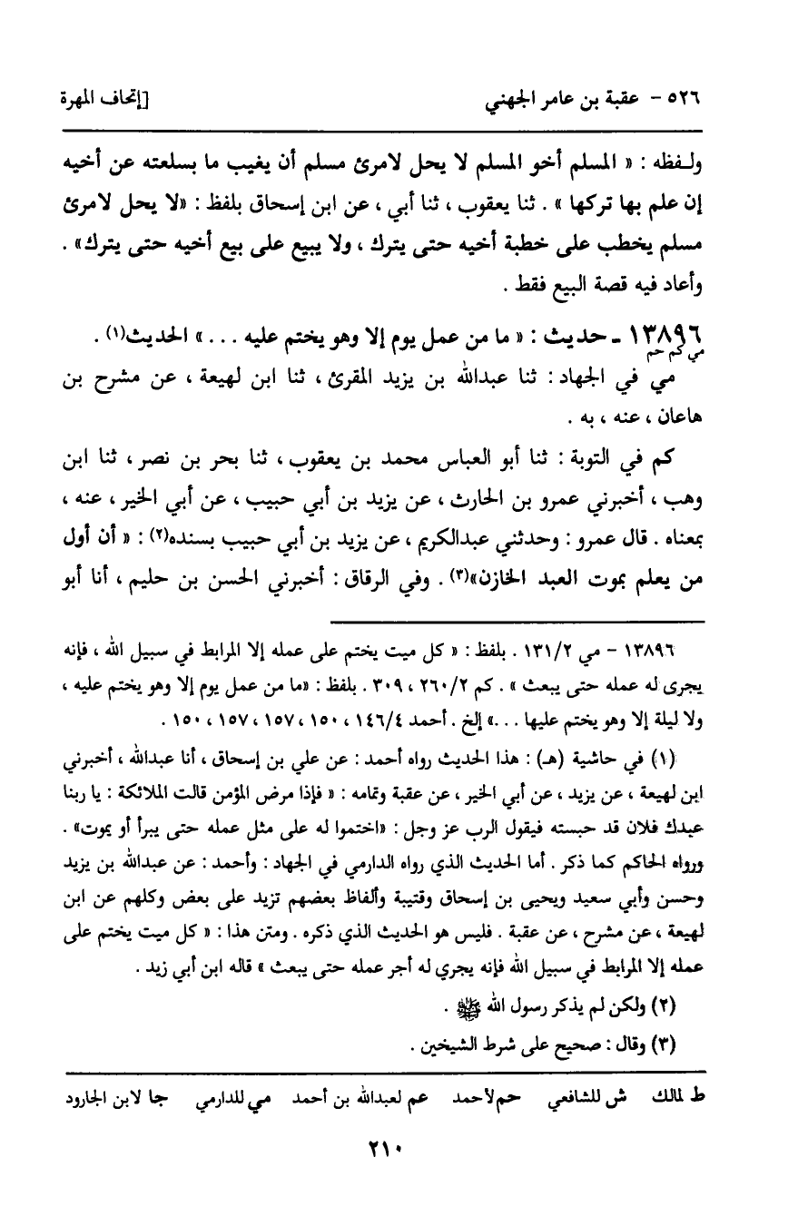 قَالَ أَحْمَدُ: ثنا عَلِيُّ بْنُ إِسْحَاقَ، أنا عَبْدُ اللَّهِ، أَخْبَرَنِي ابْنُ لَهِيعَةَ، حَدَّثَنِي يَزِيدُ، عَنْ أَبِي الْخَيْرِ، بِهِ. وَعَنْ عَبْدِ اللَّهِ بْنِ يَزِيدَ، وَحَسَنٍ، وَأَبِي سَعِيدٍ، وَيَحْيَى بْنِ إِسْحَاقَ، كُلُّهُمْ عَنِ ابْنِ لَهِيعَةَ، عَنْ مِشْرَحٍ، بِهِ. وَعَنْ قُتَيْبَةَ، عَنِ ابْنِ لَهِيعَةَ، بِهِ. وَفِيهِ زِيَادَةٌ.
