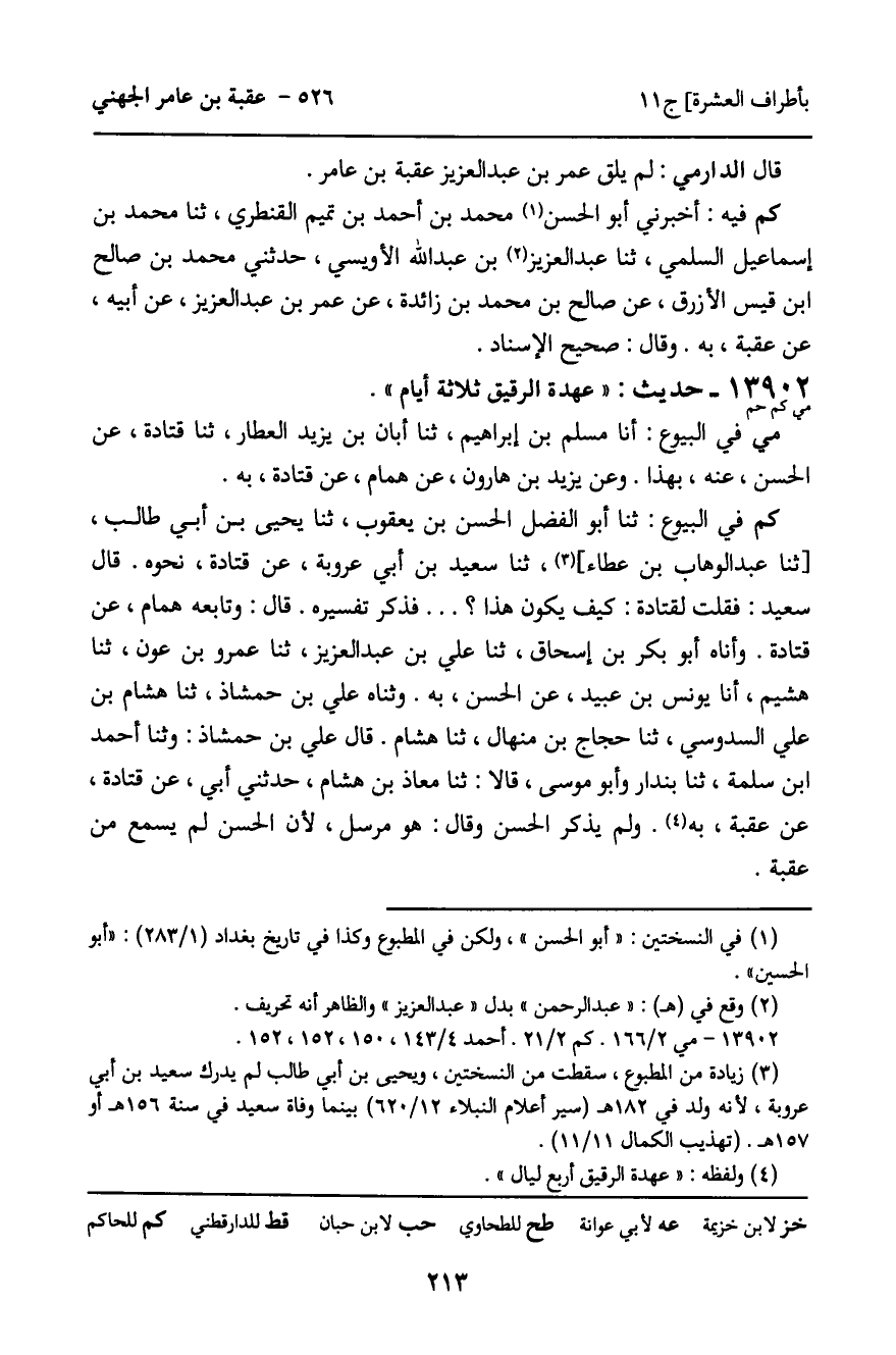 كم فِي الْبُيُوعِ: ثنا أَبُو الْفَضْلِ الْحَسَنُ بْنُ يَعْقُوبَ، ثنا يَحْيَى بْنِ أَبِي طَالِبٍ، ثنا عَبْدُ الْوَهَّابِ بْنُ عَطَاءٍ، ثنا سَعِيدُ بْنُ أَبِي عَرُوبَةَ، عَنْ قَتَادَةَ، نَحْوَهُ. قَالَ سَعِيدٌ: فَقُلْتُ لِقَتَادَةَ: كَيْفَ يَكُونُ هَذَا؟ ... فَذَكَرَ تَفْسِيرَهُ. قَالَ: وَتَابَعَهُ هَمَّامٌ، عَنْ قَتَادَةَ، وَأناه أَبُو بَكْرِ بْنُ إِسْحَاقَ، ثنا عَلِيُّ بْنُ عَبْدِ الْعَزِيزِ، ثنا عَمْرُو بْنُ عَوْنٍ، ثنا هُشَيْمٌ، أنا يُونُسُ بْنُ عُبَيْدٍ، عَنِ الْحَسَنِ، بِهِ. وَثناه عَلِيُّ بْنُ حَمْشَاذَ، ثنا هِشَامُ بْنُ عَلِيٍّ السَّدُوسِيُّ، ثنا حَجَّاجُ بْنُ مِنْهَالٍ، ثنا هِشَامٌ. قَالَ عَلِيُّ بْنُ حَمْشَاذَ، وَثنا أَحْمَدُ بْنُ سَلَمَةَ، ثنا بُنْدَارٌ، وَأَبُو مُوسَى، قَالا: ثنا مُعَاذُ بْنُ هِشَامٍ، حَدَّثَنِي أَبِي، عَنْ قَتَادَةَ، عَنْ عُقْبَةَ، بِهِ. وَلَمْ يَذْكُرِ الْحَسَنَ، وَقَالَ: هُوَ مُرْسَلٌ؛ لأَنَّ الْحَسَنَ لَمْ يَسْمَعْ مِنْ عُقْبَةَ.