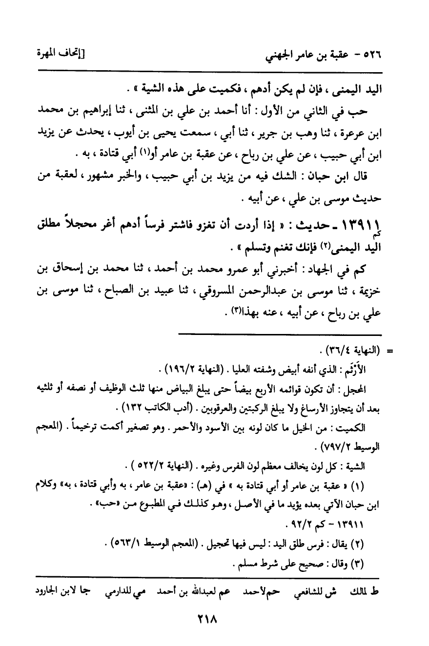 13911 - حَدِيثٌ (كم) : " إِذَا أَرَدْتَ أَنْ تَغْزُوَ فَاشْتَرِ فَرَسًا أَدْهَمَ أَغَرَّ مُحَجَّلا مُطْلَقَ الْيَدِ الْيُمْنَى فَإِنَّكَ تَغْنَمُ وَتَسْلَمُ ".