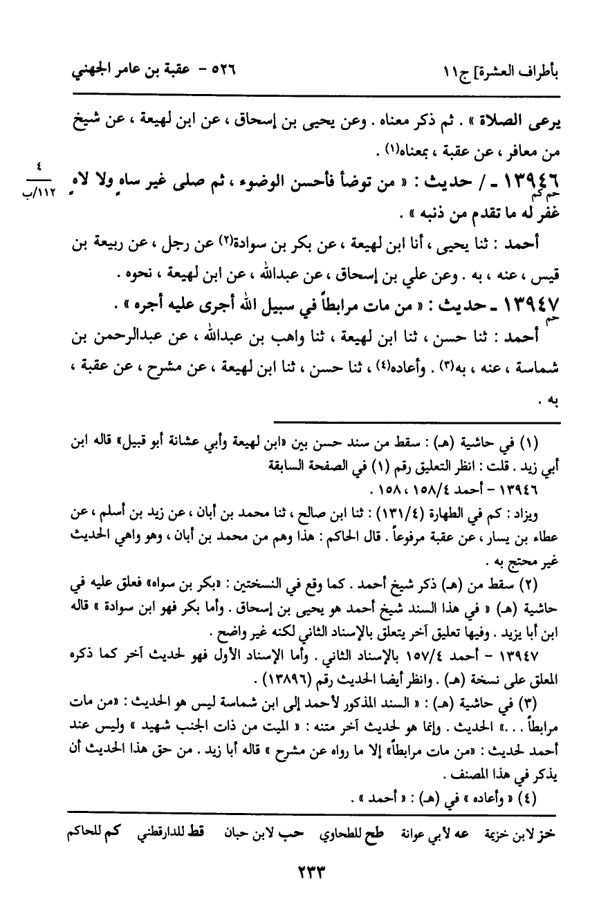 أَحْمَدُ: ثنا حَسَنٌ، ثنا ابْنُ لَهِيعَةَ، ثنا وَاهِبُ بْنُ عَبْدِ اللَّهِ، عَنْ عَبْدِ الرَّحْمَنِ بْنِ شُمَاسَةَ، عَنْهُ، بِهِ. وَأَعَادَهُ، ثنا حَسَنٌ، ثنا ابْنُ لَهِيعَةَ، عَنْ مِشْرَحٍ، عَنْ عُقْبَةَ، بِهِ.