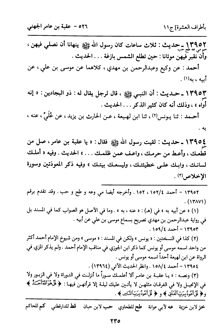 13952 - حَدِيثٌ (حم مي عه طح حب) : ثَلاثُ سَاعَاتٍ كَانَ رَسُولُ اللَّهِ، صَلَّى اللَّهُ عَلَيْهِ وَسَلَّمَ، يَنْهَانَا أَنْ نُصَلِّيَ فِيهِنَّ، وَأَنْ نُقْبِرَ فِيهِنَّ مَوْتَانَا: حِينَ تَطْلُعُ الشَّمْسُ بَازِغَةً ... الْحَدِيثَ.