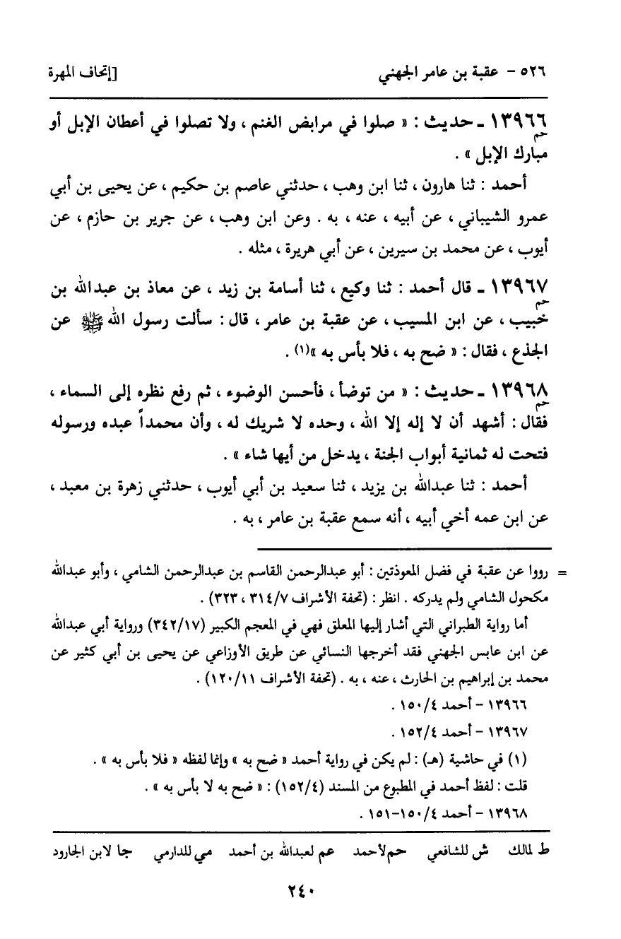 أَحْمَدُ: ثنا عَبْدُ اللَّهِ بْنُ يَزِيدَ، ثنا سَعِيدُ بْنُ أَبِي أَيُّوبَ، حَدَّثَنِي زُهْرَةُ بْنُ مَعْبَدٍ، عَنِ ابْنِ عَمِّهِ أَخِي أَبِيهِ، أَنَّهُ سَمِعَ عُقْبَةَ بْنِ عَامِرٍ، بِهِ.
