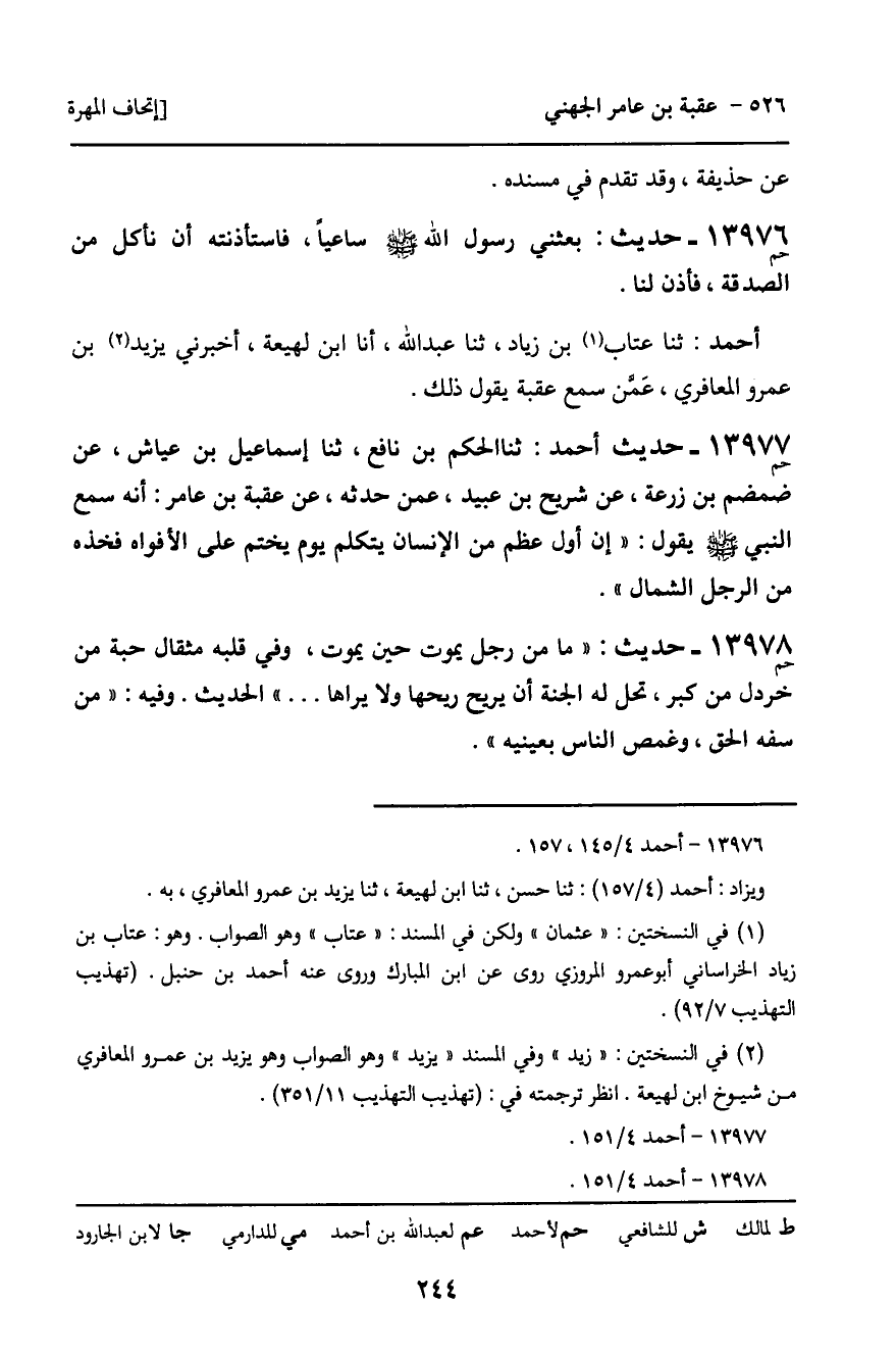 أَحْمَدُ: ثنا عَتَّابُ بْنُ زِيَادٍ، ثنا عَبْدُ اللَّهِ، أنا ابْنُ لَهِيعَةَ، أَخْبَرَنِي يَزِيدُ بْنُ عَمْرٍو الْمَعَافِرِيُّ، عَمَّنْ سَمِعَ عُقْبَةَ يَقُولُ ذَلِكَ.