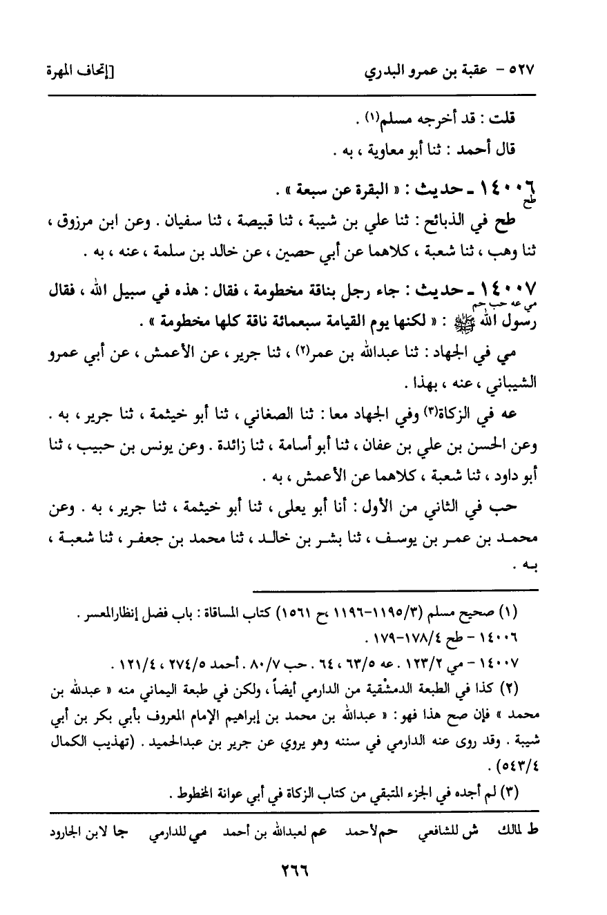 عه فِي الزَّكَاةِ، وَفِي الْجِهَادِ مَعًا: ثنا الصَّغَانِيُّ، ثنا أَبُو خَيْثَمَةَ، ثنا جَرِيرٌ، بِهِ. وَعَنِ الْحَسَنِ بْنِ عَلِيِّ بْنِ عَفَّانَ، ثنا أَبُو أُسَامَةَ، ثنا زَائِدَةُ. وَعَنْ يُونُسَ بْنِ حَبِيبٍ، ثنا أَبُو دَاوُدَ، ثنا شُعْبَةُ، كِلاهُمَا عَنِ الأَعْمَشِ، بِهِ.