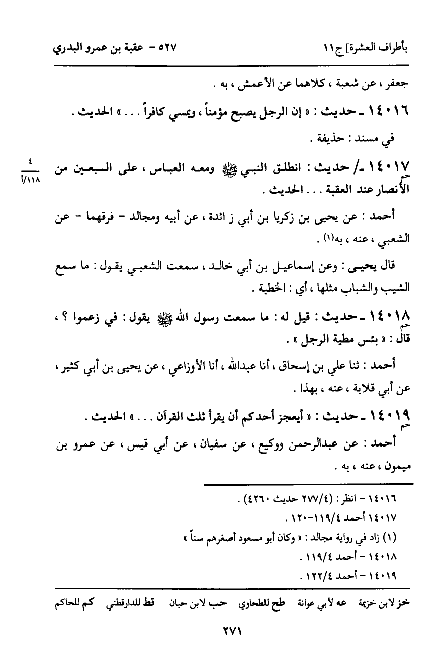 14017 - حَدِيثٌ (حم) : انْطَلَقَ النَّبِيُّ، صَلَّى اللَّهُ عَلَيْهِ وَسَلَّمَ، وَمَعَهُ الْعَبَّاسُ، عَلَى السَّبْعِينَ مِنَ الأَنْصَارِ عِنْدَ الْعَقَبَةِ ... الْحَدِيثَ.