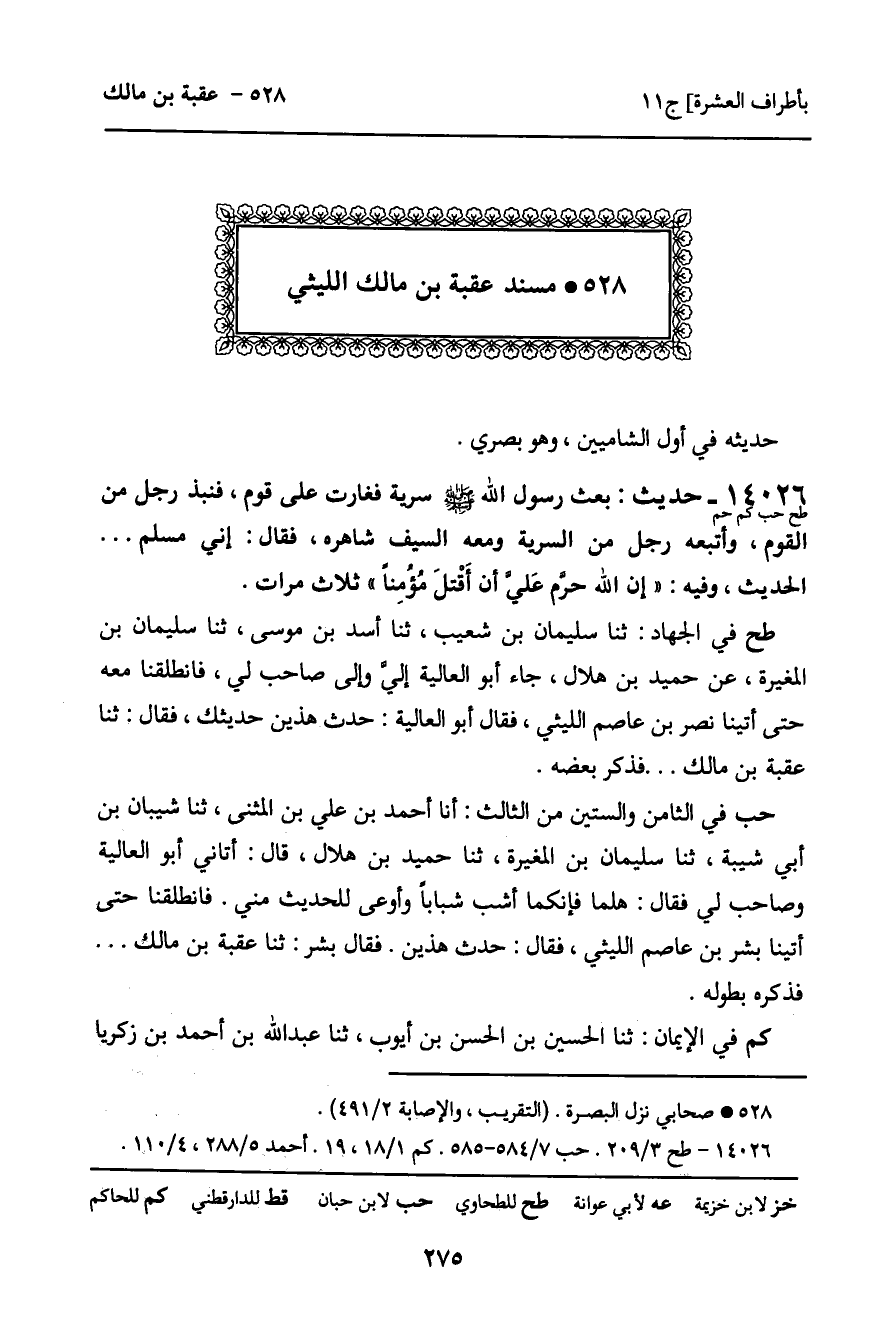528 ـ مُسْنَدُ عُقْبَةَ بْنِ مَالِكٍ اللَّيْثِيِّ.