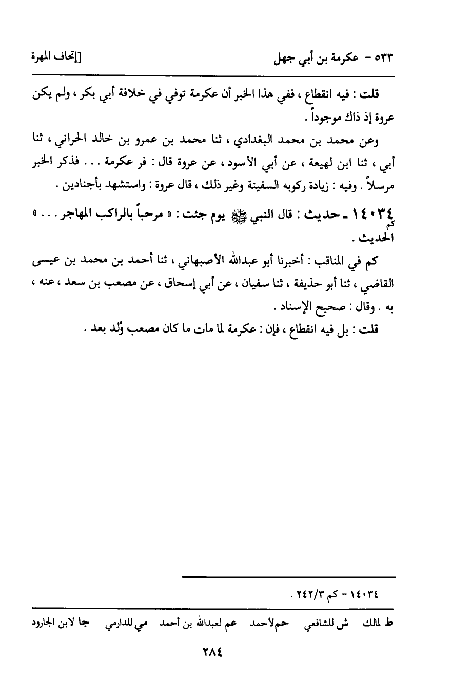 14034 - حَدِيثٌ (كم) : قَالَ النَّبِيُّ، صَلَّى اللَّهُ عَلَيْهِ وَسَلَّمَ، يَوْمَ جِئْتُ: " مَرْحَبًا بِالرَّاكِبِ الْمُهَاجِرِ" ... الْحَدِيثَ.