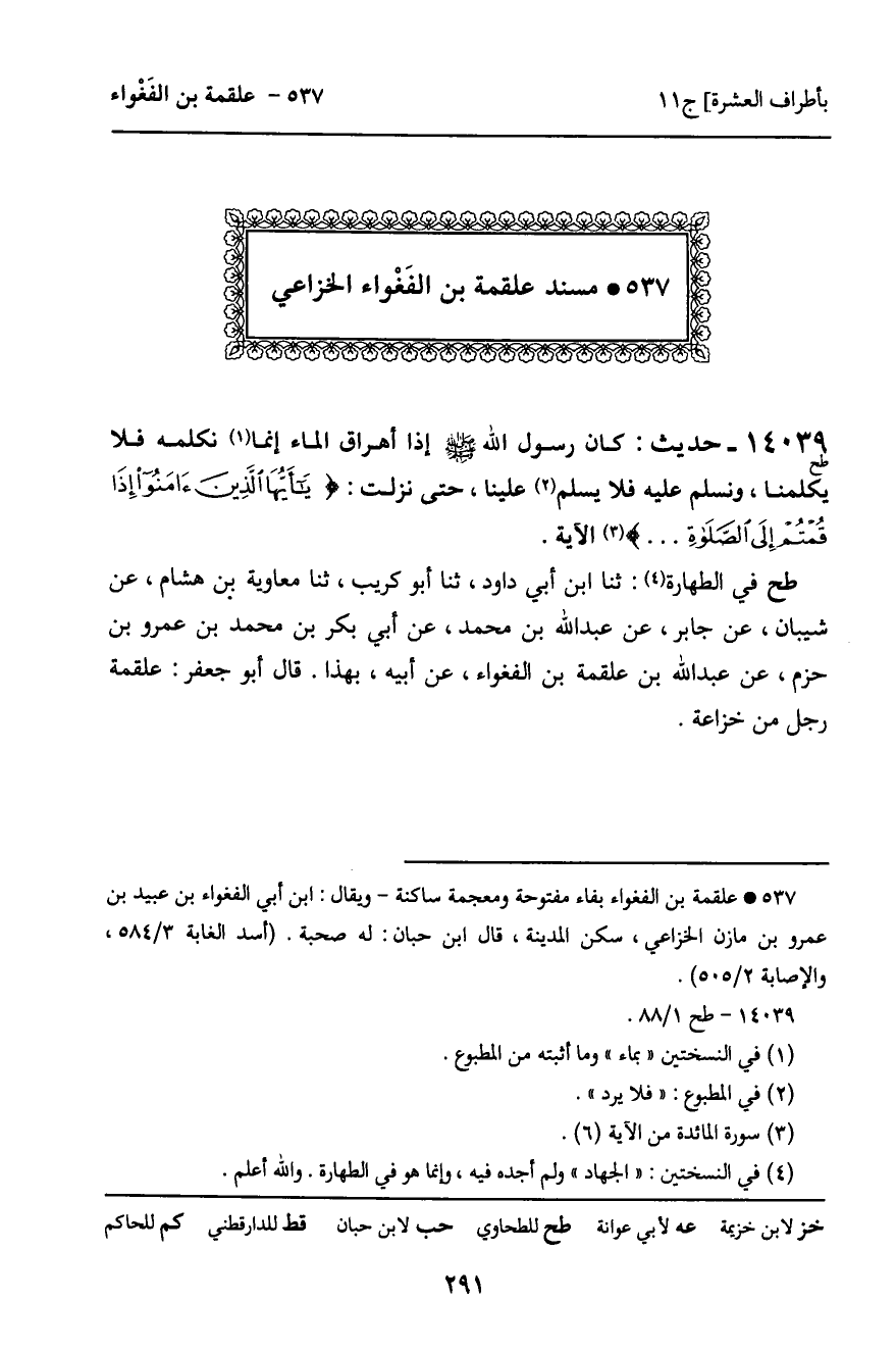 طح فِي الطَّهَارَةِ: ثنا ابْنُ أَبِي دَاوُدَ، ثنا أَبُو كُرَيْبٍ، ثنا مُعَاوِيَةُ بْنُ هِشَامٍ، عَنْ شَيْبَانَ، عَنْ جَابِرٍ، عَنْ عَبْدِ اللَّهِ بْنِ مُحَمَّدٍ، عَنْ أَبِي بَكْرِ بْنِ مُحَمَّدِ بْنِ عَمْرِو بْنِ حَزْمٍ، عَنْ عَبْدِ اللَّهِ بْنِ عَلْقَمَةَ بْنِ الْفَغْوَاءِ، عَنْ أَبِيهِ، بِهَذَا. قَالَ أَبُو جَعْفَرٍ: عَلْقَمَةُ رَجُلٌ مِنْ خُزَاعَةَ.