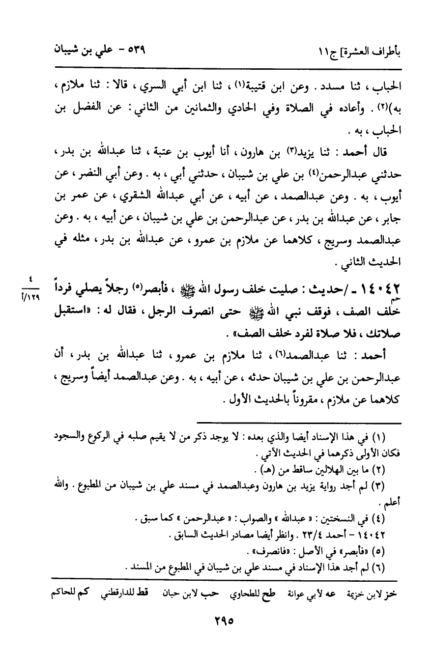 14042 - حَدِيثٌ (حم) : صَلَّيْتُ خَلْفَ رَسُولِ اللَّهِ، صَلَّى اللَّهُ عَلَيْهِ وَسَلَّمَ، فَأَبْصَرَ رَجُلا يُصَلِّي فَرْدًا خَلْفَ الصَّفِّ، فَوَقَفَ نَبِيُّ اللَّهِ، صَلَّى اللَّهُ عَلَيْهِ وَسَلَّمَ، حَتَّى انْصَرَفَ الرَّجُلُ، فَقَالَ لَهُ: " اسْتَقْبِلْ صَلاتَكَ، فَلا صَلاةَ لِفَرْدٍ خَلْفَ الصَّفِّ ".