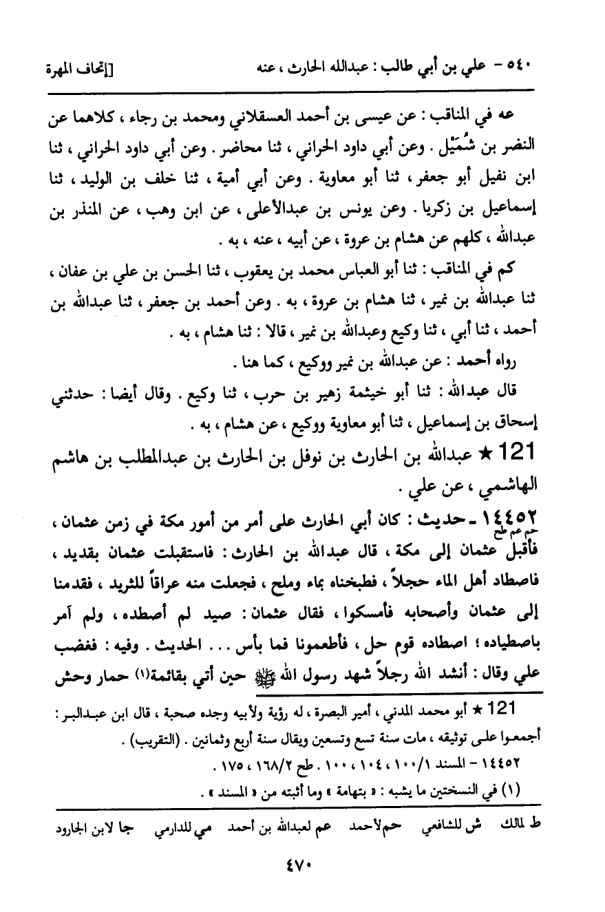 14452 - حَدِيثٌ (حم عم طح) : كَانَ أَبِي الْحَارِثُ عَلَى أَمْرٍ مِنْ أُمُورِ مَكَّةَ فِي زَمَنِ عُثْمَانَ، فَأَقْبَلَ عُثْمَانُ إِلَى مَكَّةَ، قَالَ عَبْدُ اللَّهِ بْنُ الْحَارِثِ: فَاسْتَقْبَلْتُ عُثْمَانَ بِقَدِيدٍ، فَاصْطَادَ أَهْلُ الْمَاءِ حَجَلا، فَطَبَخْنَاهُ بِمَاءٍ وَمِلْحٍ، فَجَعَلْتُ مِنْهُ عُرَاقًا لِلثَّرِيدِ، فَقَدِمْنَا إِلَى عُثْمَانَ وَأَصْحَابِهِ فَأَمْسَكُوا، فَقَالَ عُثْمَانُ: صَيْدٌ لَمْ أَصْطَدْهُ، وَلَمْ آمُرْ بِاصْطِيَادِهِ؛ اصْطَادَهُ قَوْمٌ حِلٌّ، فَأَطْعَمُونَا فَمَا بَأْسٌ ... الْحَدِيثَ. وَفِيهِ: فَغَضِبَ عَلِيٌّ، وَقَالَ: أَنْشُدُ اللَّهَ رَجُلا شَهِدَ رَسُولَ اللَّهِ، صَلَّى اللَّهُ عَلَيْهِ وَسَلَّمَ، حِينَ أُتِيَ بِقَائِمَةِ حِمَارٍ وَحْشٍ،