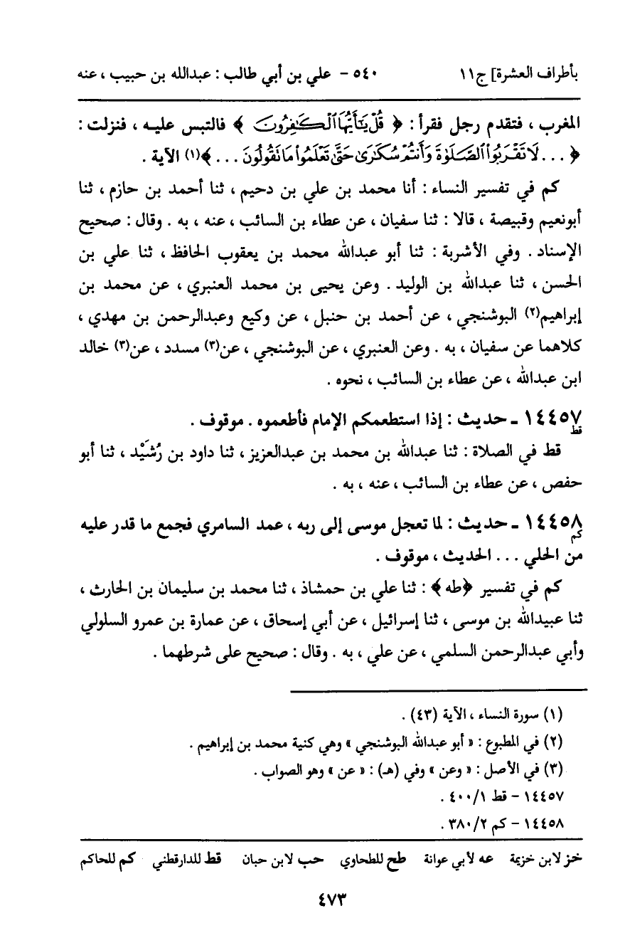كم فِي تَفْسِيرِ طه: ثنا عَلِيُّ بْنُ حَمْشَاذَ، ثنا مُحَمَّدُ بْنُ سُلَيْمَانَ بْنِ الْحَارِثِ، ثنا عُبَيْدُ اللَّهِ بْنُ مُوسَى، ثنا إِسْرَائِيلُ، عَنْ أَبِي إِسْحَاقَ، عَنْ عُمَارَةَ بْنِ عَمْرٍو السَّلُولِيُّ، وَأَبِي عَبْدِ الرَّحْمَنِ السُّلَمِيِّ، عَنْ عَلِيٍّ، بِهِ. وَقَالَ: صَحِيحٌ عَلَى شَرْطِهِمَا. .