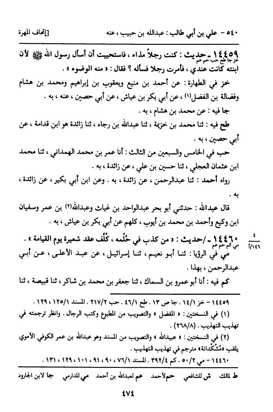 14459 - حَدِيثٌ (خز جا طح حب حم عم) : كُنْتُ رَجُلا مَذَّاءً، فَاسْتَحْيَيْتُ أَنْ أَسْألَ رَسُولَ اللَّهِ، صَلَّى اللَّهُ عَلَيْهِ وَسَلَّمَ، لأَنَّ ابْنَتَهُ كَانَتْ عِنْدِي، فَأَمَرْتُ رَجُلا فَسَأَلَهُ؟ فَقَالَ: " مِنْهُ الْوُضُوءُ ".