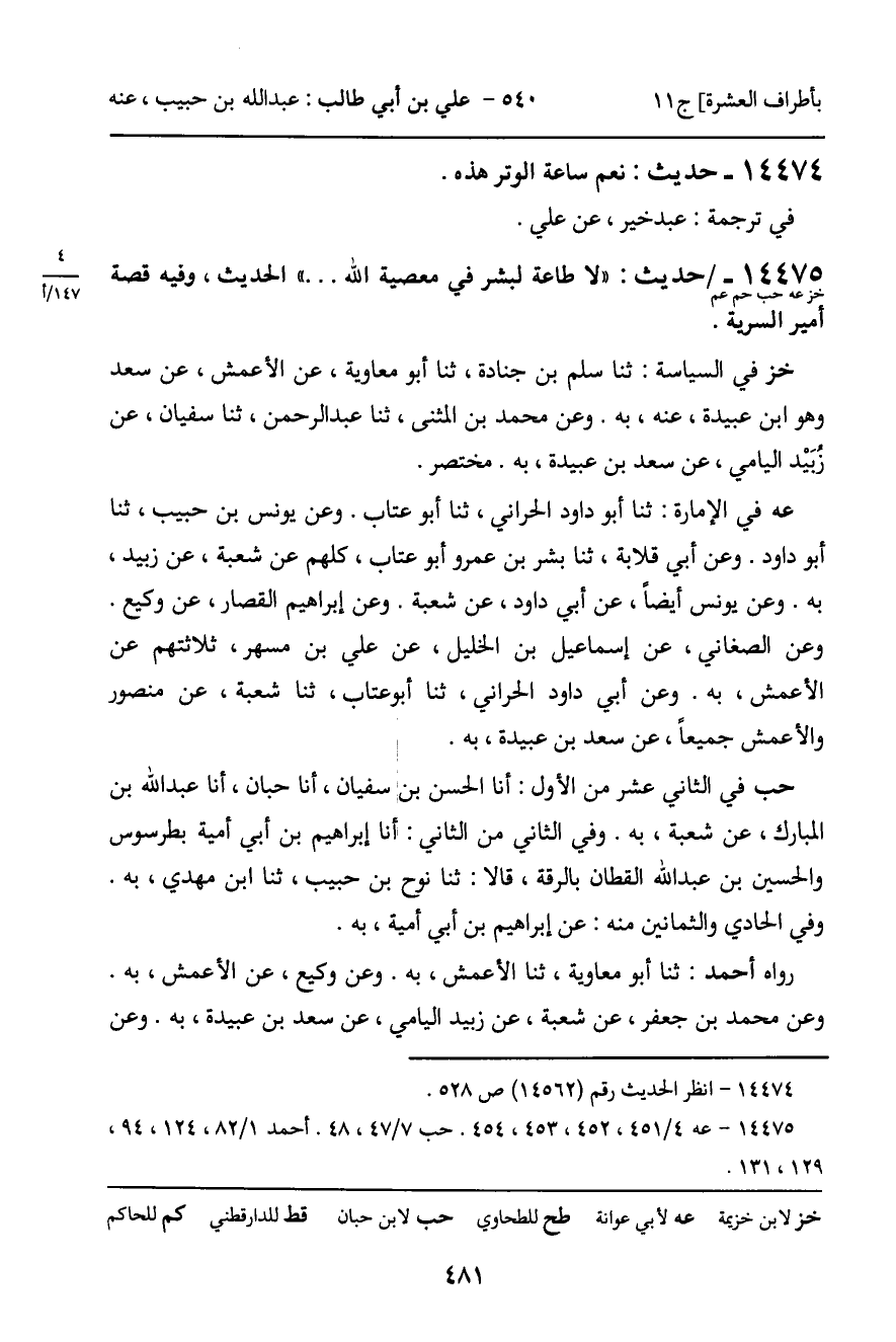 عه فِي الإِمَارَةِ: ثنا أَبُو دَاوُدَ الْحَرَّانِيُّ، ثنا أَبُو عَتَّابٍ. وَعَنْ يُونُسَ بْنِ حَبِيبٍ، ثنا أَبُو دَاوُدَ. وَعَنْ أَبِي قِلابَةَ، ثنا بِشْرُ بْنُ عَمْرٍو أَبُو عَتَّابٍ، كُلُّهُمْ عَنْ شُعْبَةَ، عَنْ زُبَيْدٍ، بِهِ. وَعَنْ يُونُسَ أَيْضًا، عَنْ أَبِي دَاوُدَ، عَنْ شُعْبَةَ. وَعَنْ إِبْرَاهِيمَ الْقَصَّارِ، عَنْ وَكِيعٍ. وَعَنِ الصَّغَانِيِّ، عَنْ إِسْمَاعِيلَ بْنِ الْخَلِيلِ، عَنْ عَلِيِّ بْنِ مُسْهِرٍ، ثَلاثَتُهُمْ عَنِ الأَعْمَشِ، بِهِ. وَعَنْ أَبِي دَاوُدَ الْحَرَّانِيِّ، ثنا أَبُو عَتَّابٍ، ثنا شُعْبَةُ، عَنْ مَنْصُورٍ، وَالأَعْمَشِ جَمِيعًا، عَنْ سَعْدِ بْنِ عُبَيْدَةَ، بِهِ.