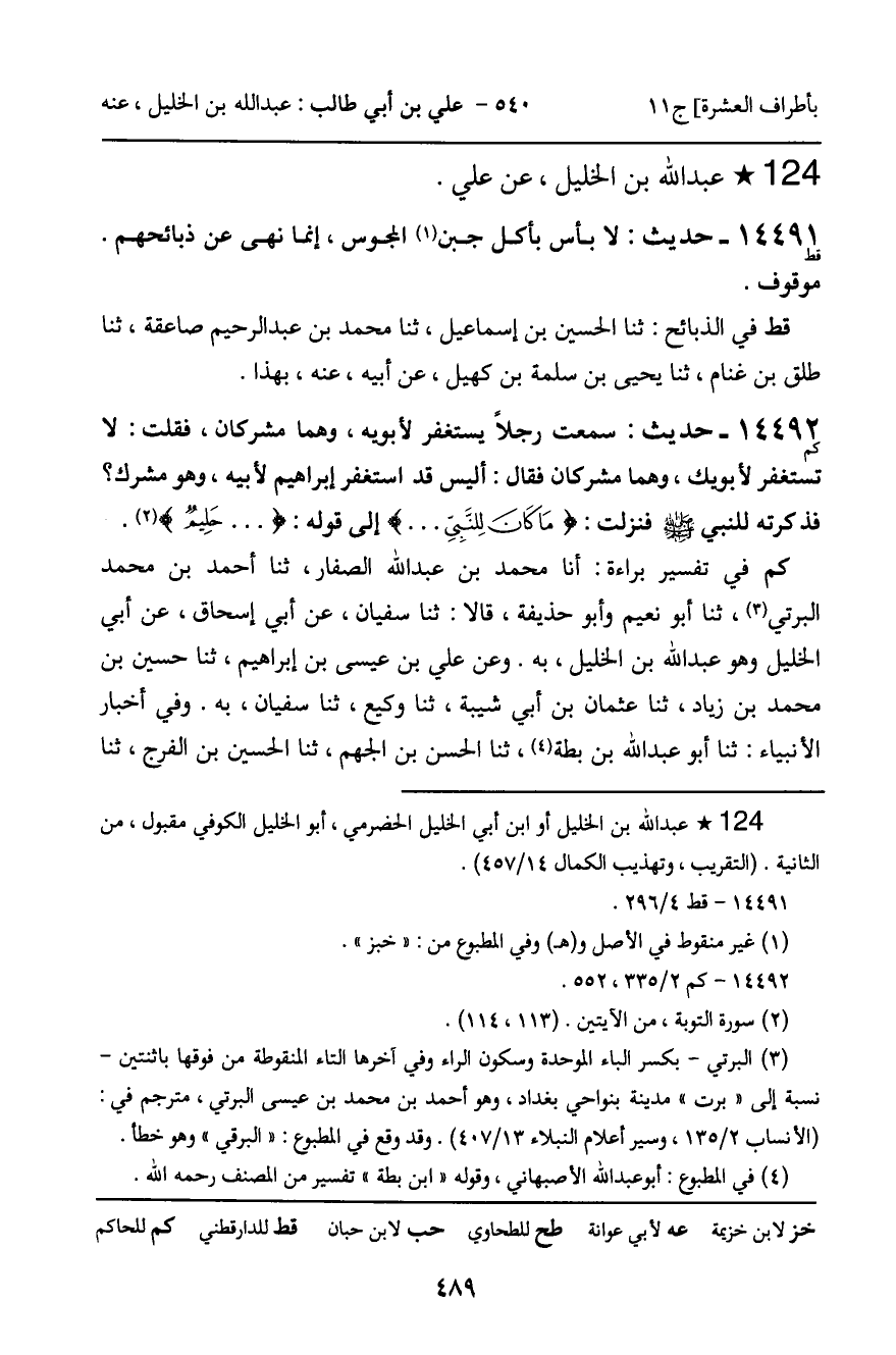 كم فِي تَفْسِيرِ بَرَاءَةَ: أنا مُحَمَّدُ بْنُ عَبْدِ اللَّهِ الصَّفَّارُ، ثنا أَحْمَدُ بْنُ مُحَمَّدٍ الْبِرْتِيُّ، ثنا أَبُو نُعَيْمٍ، وَأَبُو حُذَيْفَةَ، قَالا: ثنا سُفْيَانُ، عَنْ أَبِي إِسْحَاقَ، عَنْ أَبِي الْخَلِيلِ، وَهُوَ عَبْدُ اللَّهِ بْنُ الْخَلِيلِ، بِهِ. وَعَنْ عَلِيِّ بْنِ عِيسَى بْنِ إِبْرَاهِيمَ، ثنا حُسَيْنُ بْنُ مُحَمَّدِ بْنِ زِيَادٍ، ثنا عُثْمَانُ بْنُ أَبِي شَيْبَةَ، ثنا وَكِيعٌ، ثنا سُفْيَانُ، بِهِ. وَفِي أَخْبَارِ الأَنْبِيَاءِ: ثنا أَبُو عَبْدِ اللَّهِ بْنُ بُطَّةَ، ثنا الْحَسَنُ بْنُ الْجَهْمِ، ثنا الْحُسَيْنُ بْنُ الْفَرَجِ، ثنا