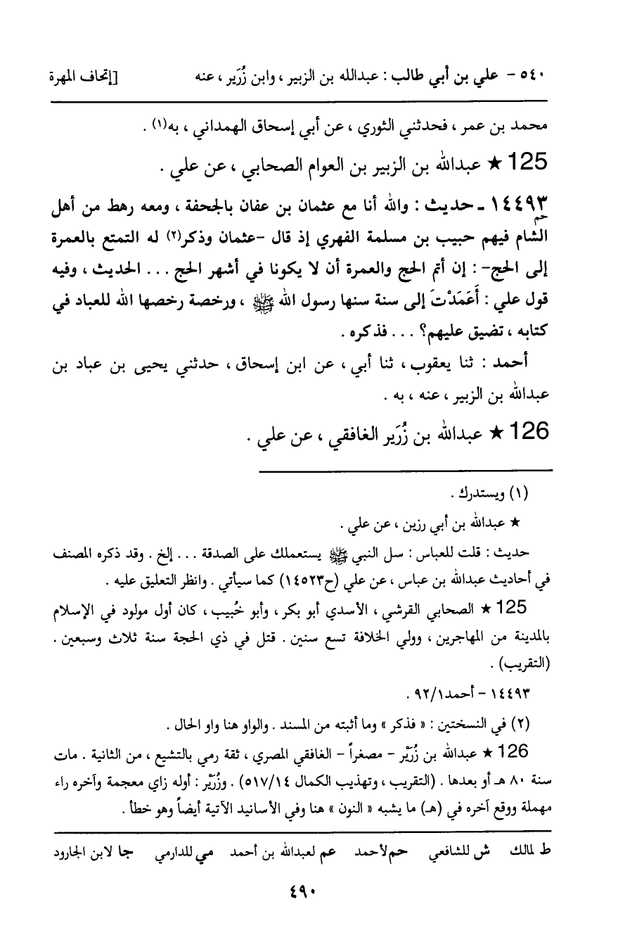 14493 - حَدِيثٌ (حم) : وَاللَّهِ أَنَا مَعَ عُثْمَانَ بْنِ عَفَّانَ بِالْجُحْفَةِ، وَمَعَهُ رَهْطٌ مِنْ أَهْلِ الشَّامِ؛ فِيهِمْ: حَبِيبُ بْنُ مَسْلَمَةَ الْفِهْرِيِّ، إِذْ قَالَ عُثْمَانُ، وَذَكَرَ لَهُ التَّمَتُّعَ بِالْعُمْرَةِ إِلَى الْحَجِّ: إِنَّ أَتَمَّ الْحَجِّ وَالْعُمْرَةِ أَنْ لا يَكُونَا فِي أَشْهُرِ الْحَجِّ ... الْحَدِيثَ، وَفِيهِ قَوْلُ عَلِيٍّ: أَعَمَدْتَ إِلَى سُنَّةٍ سَنَّهَا رَسُولُ اللَّهِ، صَلَّى اللَّهُ عَلَيْهِ وَسَلَّمَ، وَرُخْصَةٍ رَخَّصَهَا اللَّهُ لِلْعِبَادِ فِي كِتَابِهِ، تُضَيِّقُ عَلَيْهِمْ؟ ... فَذَكَرَهُ.