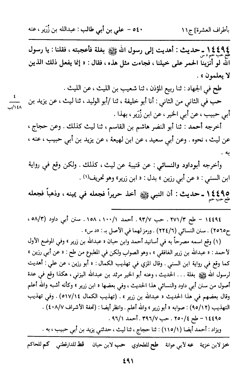 14495 - حَدِيثٌ (طح حب حم) : أَنَّ النَّبِيَّ، صَلَّى اللَّهُ عَلَيْهِ وَسَلَّمَ، أَخَذَ حَرِيرًا فَجَعَلَهُ فِي يَمِينِهِ، وَذَهَبًا فَجَعَلَهُ