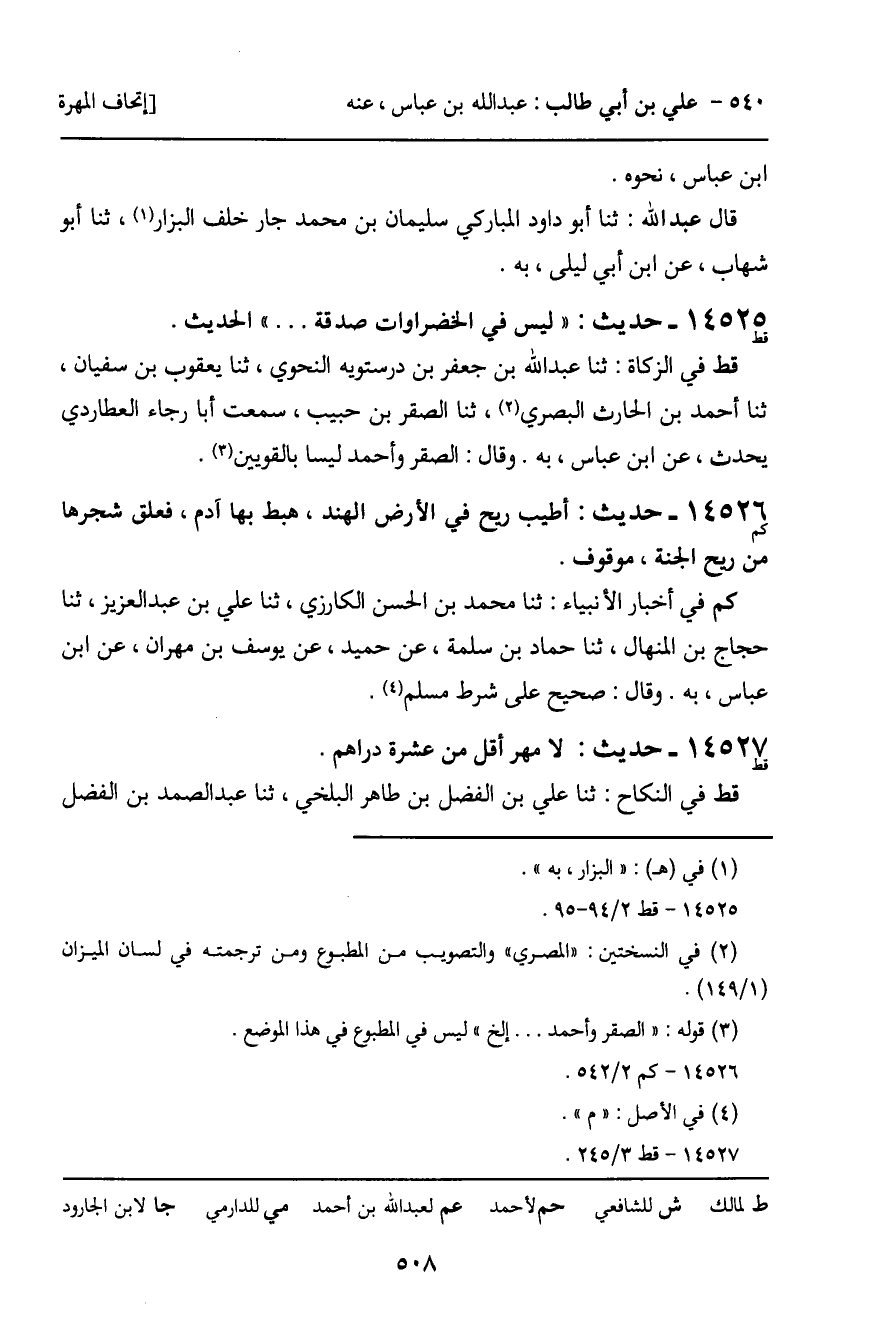قط فِي الزَّكَاةِ: ثنا عَبْدُ اللَّهِ بْنُ جَعْفَرِ بْنِ دُرُسْتُوَيْهِ النَّحْوِيُّ، ثنا يَعْقُوبُ بْنُ سُفْيَانَ، ثنا أَحْمَدُ بْنُ الْحَارِثِ الْبَصْرِيُّ، ثنا الصَّقْرُ بْنُ حَبِيبٍ، سَمِعْتُ أَبَا رَجَاءٍ الْعُطَارِدِيَّ يُحَدِّثُ، عَنِ ابْنِ عَبَّاسٍ، بِهِ. وَقَالَ: الصَّقْرُ وَأَحْمَدُ لَيْسَا بِالْقَوِيَّيْنِ.