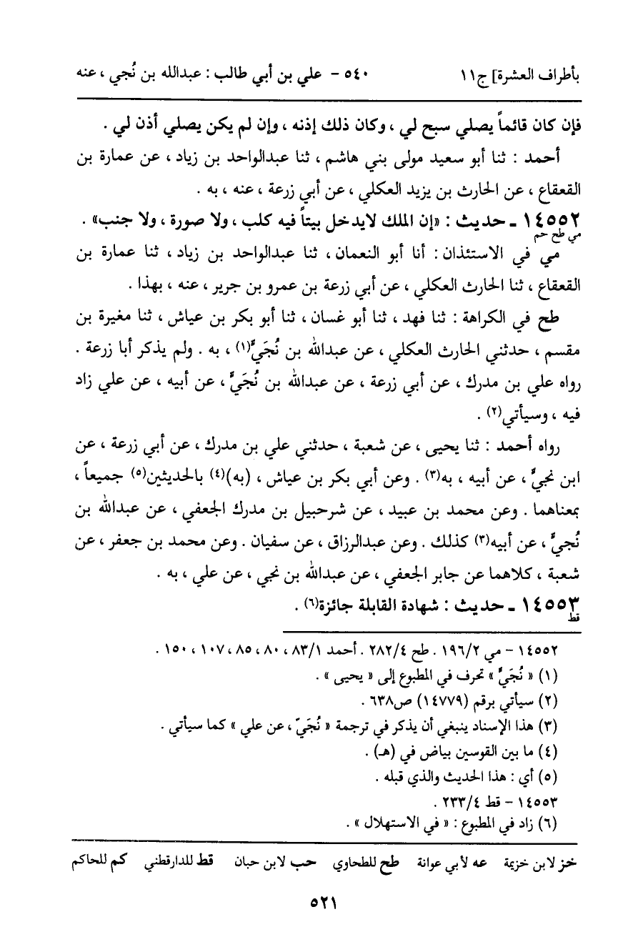 رَوَاهُ أَحْمَدُ: ثنا يَحْيَى، عَنْ شُعْبَةَ، حَدَّثَنِي عَلِيُّ بْنُ مُدْرَكٍ، عَنْ أَبِي زُرْعَةَ، عَنِ ابْنِ نُجَيٍّ، عَنْ أَبِيهِ، بِهِ. وَعَنْ أَبِي بَكْرِ بْنِ عَيَّاشٍ، بِهِ بِالْحَدِيثَيْنِ جَمِيعًا، بِمَعْنَاهُمَا. وَعَنْ مُحَمَّدِ بْنِ عُبَيْدٍ، عَنْ شُرَحْبِيلَ بْنِ مُدْرَكٍ الْجُعْفِيِّ، عَنْ عَبْدِ اللَّهِ بْنِ نُجَيٍّ، عَنْ أَبِيهِ، كَذَلِكَ، وَعَنْ عَبْدِ الرَّزَّاقِ، عَنْ سُفْيَانَ، وَعَنْ مُحَمَّدِ بْنِ جَعْفَرٍ، عَنْ شُعْبَةَ، كِلاهُمَا عَنْ جَابِرٍ الْجُعْفِيِّ، عَنْ عَبْدِ اللَّهِ بْنِ نُجَيٍّ، عَنْ عَلِيٍّ، بِهِ.