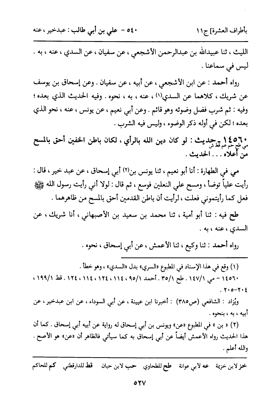 مي فِي الطَّهَارَةِ: أنا أَبُو نُعَيْمٍ، ثنا يُونُسُ بْنُ أَبِي إِسْحَاقَ، عَنْ عَبْدِ خَيْرٍ، قَالَ: رَأَيْتُ عَلِيًّا تَوَضَّأَ، وَمَسَحَ عَلَى النَّعْلَيْنِ فَوَسِعَ، ثُمَّ قَالَ: لَوْلا أَنِّي رَأَيْتُ رَسُولَ اللَّهِ، صَلَّى اللَّهُ عَلَيْهِ وَسَلَّمَ، فَعَلَ كَمَا رَأَيْتُمُونِي فَعَلْتُ، لَرَأَيْتُ أَنَّ بَاطِنَ الْقَدَمَيْنِ أَحَقُّ بِالْمَسْحِ مِنْ ظَاهِرِهِمَا.