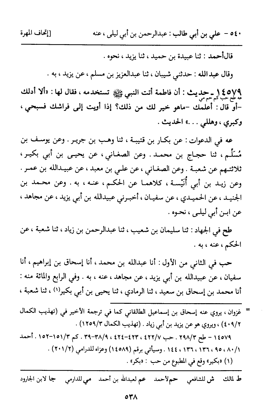 14579 - حَدِيثٌ (عه طح حب كم حم مي) : أَنَّ فَاطِمَةَ أَتَتِ النَّبِيَّ، صَلَّى اللَّهُ عَلَيْهِ وَسَلَّمَ، تَسْتَخْدِمُهُ، فَقَالَ لَهَا: " أَلا أَدُلُّكِ، أَوْ قَالَ: أُعَلِّمُكِ، مَا هُوَ خَيْرٌ لَكِ مِنْ ذَلِكَ؟ إِذَا أَوَيْتِ إِلَى فِرَاشِكِ فَسَبِّحِي، وَكَبِّرِي، وَهَلِّلِي" ... الْحَدِيثَ.
