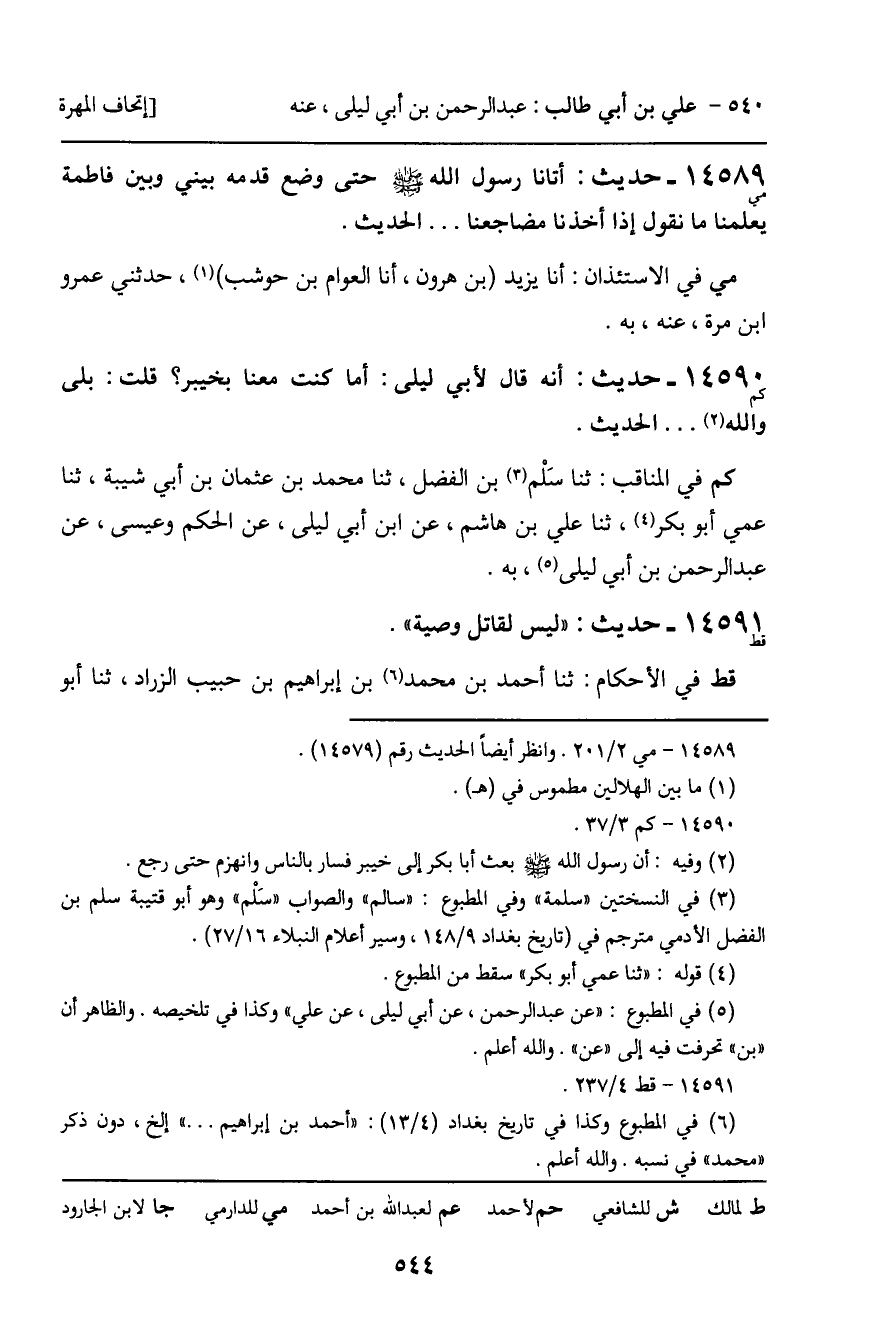 كم فِي الْمَنَاقِبِ: ثنا سَلْمُ بْنُ الْفَضْلِ، ثنا مُحَمَّدُ بْنُ عُثْمَانَ بْنِ أَبِي شَيْبَةَ، ثنا عَمِّي أَبُو بَكْرٍ، ثنا عَلِيُّ بْنُ هَاشِمٍ، عَنِ ابْنِ أَبِي لَيْلَى، عَنِ الْحَكَمِ، وَعِيسَى، عَنْ عَبْدِ الرَّحْمَنِ بْنِ أَبِي لَيْلَى، بِهِ.