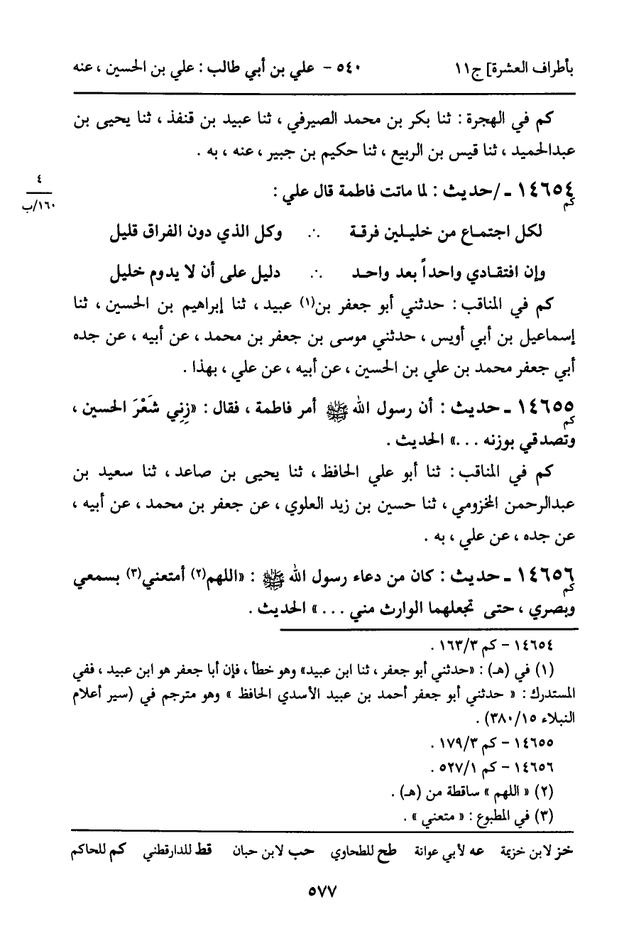 كم فِي الْمَنَاقِبِ: ثنا أَبُو عَلِيٍّ الْحَافِظُ، ثنا يَحْيَى بْنُ صَاعِدٍ، ثنا سَعِيدُ بْنُ عَبْدِ الرَّحْمَنِ الْمَخْزُومِيُّ، ثنا حُسَيْنُ بْنُ زَيْدٍ الْعَلَوِيُّ، عَنْ جَعْفَرِ بْنِ مُحَمَّدٍ، عَنْ أَبِيهِ، عَنْ جَدِّهِ، عَنْ عَلِيٍّ، بِهِ.