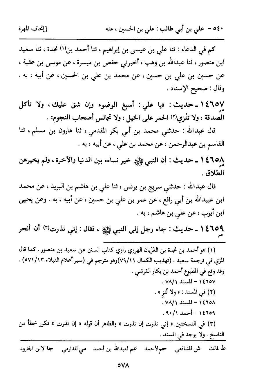 14657 - حَدِيثٌ (عم) : " يَا عَلِيُّ: أَسْبِغِ الْوُضُوءَ وَإِنْ شَقَّ عَلَيْكَ، وَلا تَأْكُلِ الصَّدَقَةَ، وَلا تُنْزِي الْحُمُرَ عَلَى الْخَيْلِ، وَلا تُجَالِسْ أَصْحَابَ النُّجُومِ ".