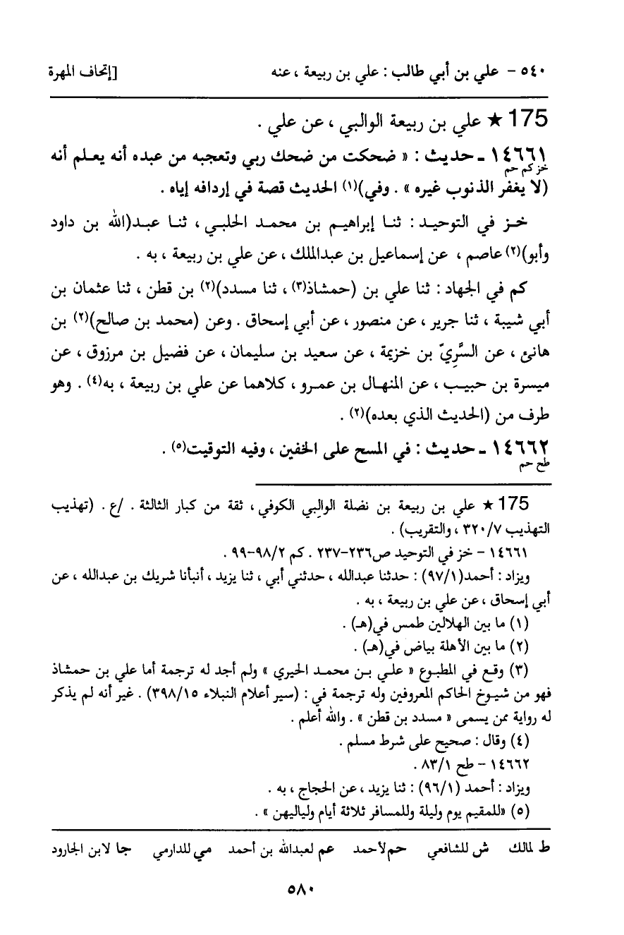 كم فِي الْجِهَادِ: ثنا عَلِيُّ بْنُ حَمْشَاذَ، ثنا مُسَدَّدُ بْنُ قَطَنٍ، ثنا عُثْمَانُ بْنُ أَبِي شَيْبَةَ، ثنا جَرِيرٌ، عَنْ مَنْصُورٍ، عَنْ أَبِي إِسْحَاقَ. وَعَنْ مُحَمَّدِ بْنِ صَالِحِ بْنِ هَانِئٍ، عَنِ السَّرِيِّ بْنِ خُزَيْمَةَ، عَنْ سَعِيدِ بْنِ سُلَيْمَانَ، عَنْ فُضَيْلِ بْنِ مَرْزُوقٍ، عَنْ مَيْسَرَةَ بْنِ حَبِيبٍ، عَنِ الْمِنْهَالِ بْنِ عَمْرٍو، كِلاهُمَا عَنْ عَلِيِّ بْنِ رَبِيعَةَ، بِهِ. وَهُوَ طَرَفٌ مِنَ الْحَدِيثِ الَّذِي بَعْدَهُ.