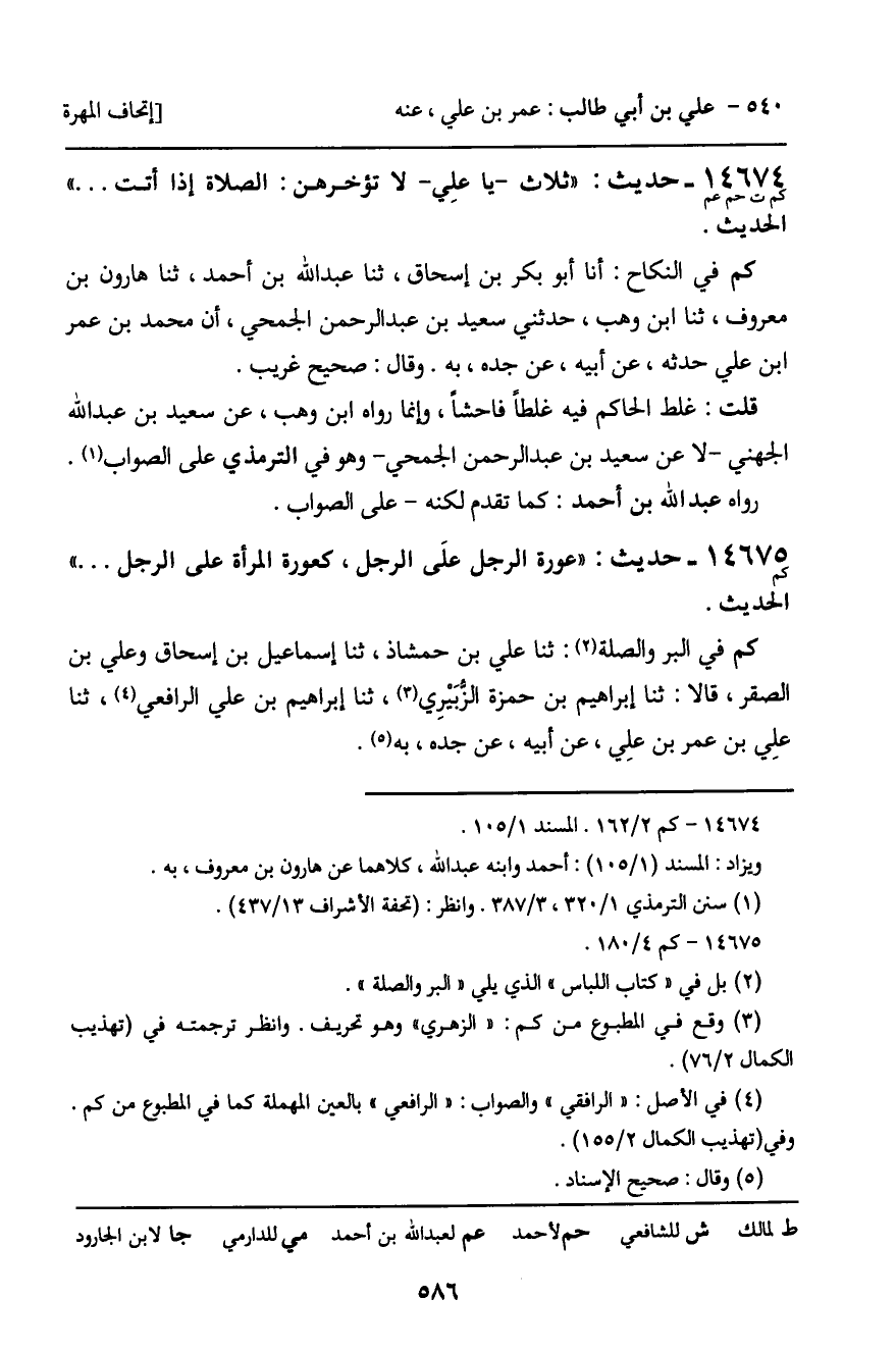 14674 - حَدِيثٌ (كم ت حم عم) : " ثَلاثٌ، يَا عَلِيُّ، لا تُؤَخِّرْهُنَّ: الصَّلاةُ إِذَا أَتَتْ" ... الْحَدِيثَ.