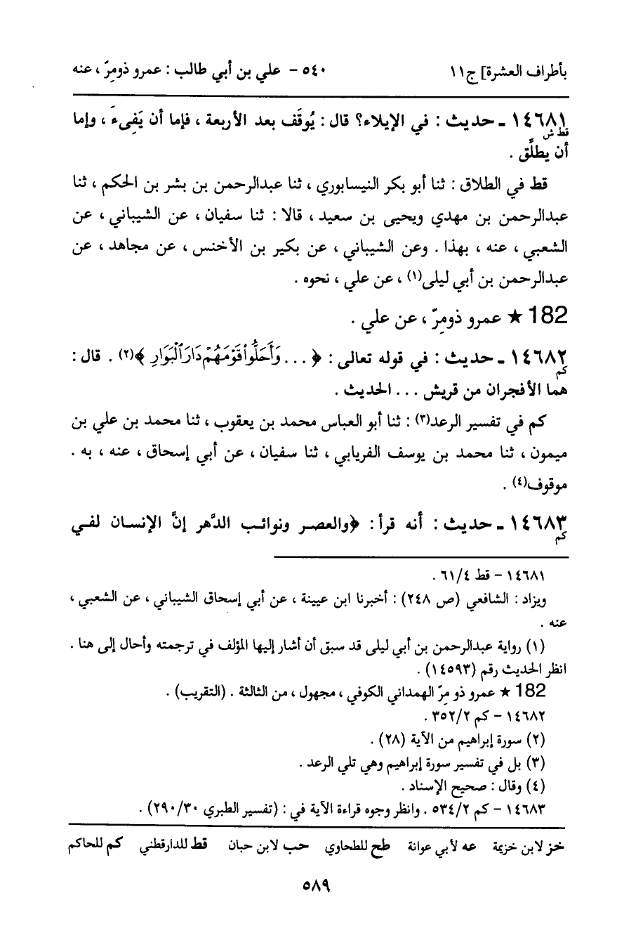 قط فِي الطَّلاقِ: ثنا أَبُو بَكْرٍ النَّيْسَابُورِيُّ، ثنا عَبْدُ الرَّحْمَنِ بْنُ بِشْرِ بْنِ الْحَكَمِ، ثنا عَبْدُ الرَّحْمَنِ بْنُ مَهْدِيٍّ، وَيَحْيَى بْنُ سَعِيدٍ، قَالا: ثنا سُفْيَانُ، عَنِ الشَّيْبَانِيِّ، عَنِ الشَّعْبِيِّ، عَنْهُ، بِهَذَا. وَعَنِ الشَّيْبَانِيِّ، عَنْ بُكَيْرِ بْنِ الأَخْنَسِ، عَنْ مُجَاهِدٍ، عَنْ عَبْدِ الرَّحْمَنِ بْنِ أَبِي لَيْلَى، عَنْ عَلِيٍّ، نَحْوَهُ.