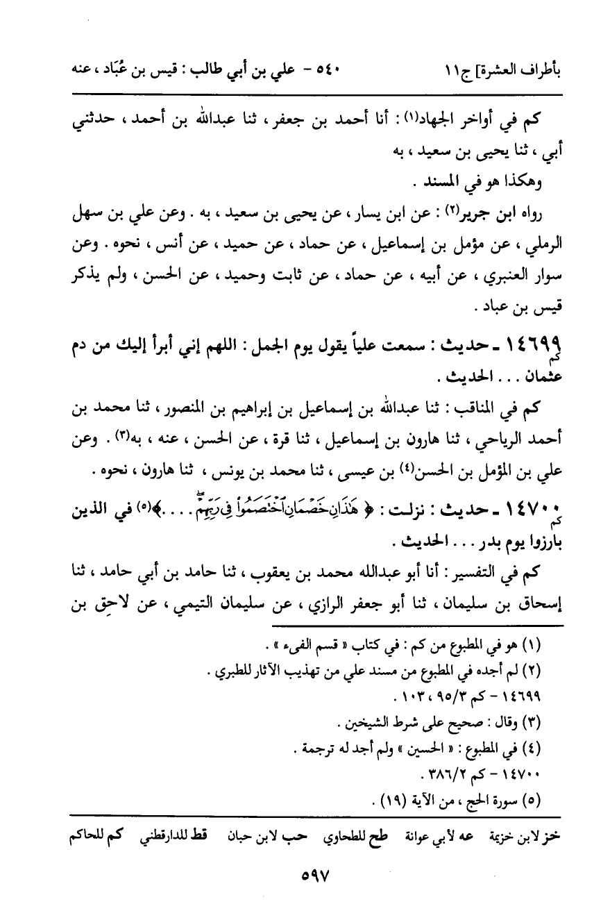 14699 - حَدِيثٌ (كم) : سَمِعْتُ عَلِيًّا يَقُولُ يَوْمَ الْجَمَلِ: " اللَّهُمَّ إِنِّي أَبْرَأُ إِلَيْكَ مِنْ دَمِ عُثْمَانَ " ... الْحَدِيثَ.
