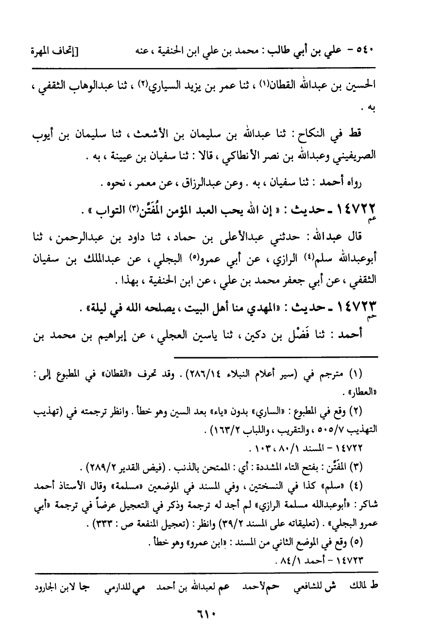14723 - حَدِيثٌ (حم) : " الْمَهْدِيُّ مِنَّا أَهْلَ الْبَيْتِ، يُصْلِحُهُ اللَّهُ فِي لَيْلَةٍ ".