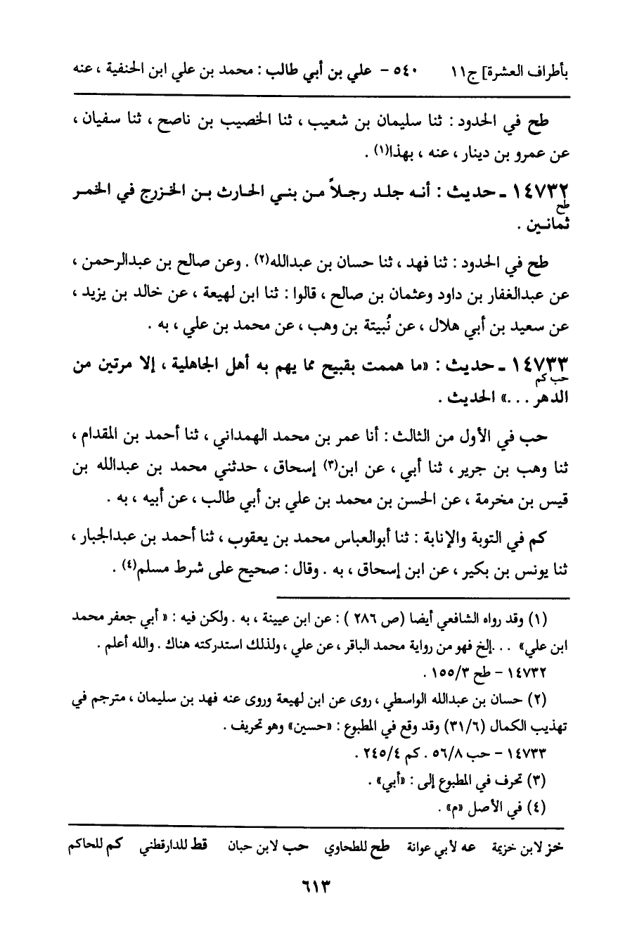 طح فِي الْحُدُودِ: ثنا فَهْدٌ، ثنا حَسَّانُ بْنُ عَبْدِ اللَّهِ، وَعَنْ صَالِحِ بْنِ عَبْدِ الرَّحْمَنِ، عَنْ عَبْدِ الْغَفَّارِ بْنِ دَاوُدَ، وَعُثْمَانَ بْنِ صَالِحٍ، قَالُوا: ثنا ابْنُ لَهِيعَةَ، عَنْ خَالِدِ بْنِ يَزِيدَ، عَنْ سَعِيدِ بْنِ أَبِي هِلالٍ، عَنْ نُبَيْتَةَ بْنِ وَهْبٍ، عَنْ مُحَمَّدِ بْنِ عَلِيٍّ، بِهِ.
