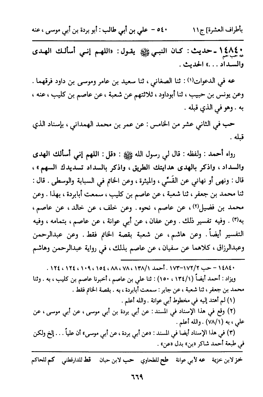 رَوَاهُ أَحْمَدُ: قَالَ لِي رَسُولُ اللَّهِ، صَلَّى اللَّهُ عَلَيْهِ وَسَلَّمَ: " قُلِ: اللَّهُمَّ إِنِّي أَسْأَلُكَ الْهُدَى وَالسَّدَادَ، وَاذْكُرْ بِالْهُدَى هِدَايَتَكَ الطَّرِيقَ، وَاذْكُرْ بِالسَّدَادِ تَسْدِيدَكَ السَّهْمَ "، قَالَ: وَنَهَى، أَوْ نَهَانِي، عَنِ الْقَسِّيِّ، وَالْمِيثَرَةِ، وَعَنِ الْخَاتَمِ فِي السَّبَّابَةِ وَالْوُسْطَى. قَالَ: ثنا مُحَمَّدُ بْنُ جَعْفَرٍ، ثنا شُعْبَةُ، عَنْ عَاصِمِ بْنِ كُلَيْبٍ، سَمِعْتُ أَبَا بُرْدَةَ، بِهَذَا. وَعَنْ مُحَمَّدِ بْنِ فُضَيْلٍ، عَنْ عَاصِمٍ، نَحْوَهُ. وَعَنْ خَلَفٍ، عَنْ خَالِدٍ، عَنْ عَاصِمٍ، بِهِ. وَفِيهِ تَفْسِيرُ ذَلِكَ. وَعَنْ عَفَّانَ، عَنْ أَبِي عَوَانَةَ، عَنْ عَاصِمٍ، بِتَمَامِهِ، وَفِيهِ التَّفْسِيرُ أَيْضًا. وَعَنْ هَاشِمٍ، عَنْ شُعْبَةَ، بِقِصَّةِ الْخَاتَمِ فَقَطْ. وَعَنْ عَبْدِ الرَّحْمَنِ، وَعَبْدِ الرَّزَّاقِ، كِلاهُمَا عَنْ سُفْيَانَ، عَنْ عَاصِمٍ، بِذَلِكَ، فِي رِوَايَةِ عَبْدِ الرَّحْمَنِ، وَهَاشِمٌ