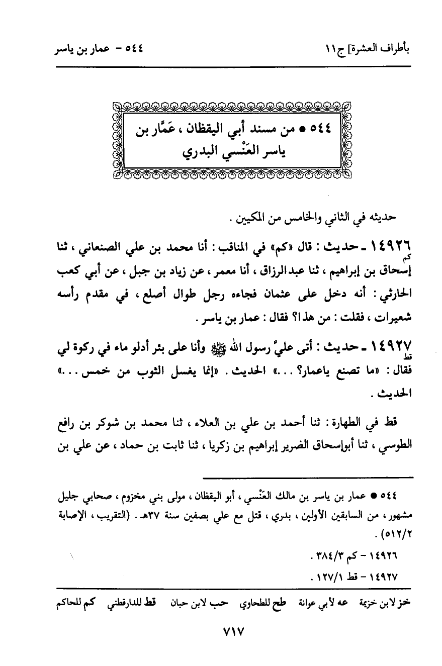 544 ـ مِنْ مُسْنَدِ أَبِي الْيَقْظَانِ عَمَّارِ بْنِ يَاسِرٍ الْعَنْسِيِّ الْبَدْرِيِّ.