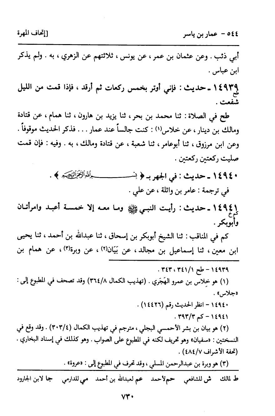 طح فِي الصَّلاةِ: ثنا مُحَمَّدُ بْنُ بَحْرٍ، ثنا يَزِيدُ بْنُ هَارُونَ، ثنا هَمَّامٌ، عَنْ قَتَادَةَ، وَمَالِكِ بْنِ دِينَارٍ، عَنْ خِلاسٍ: كُنْتُ جَالِسًا عِنْدَ عَمَّارٍ ... فَذَكَرَ الْحَدِيثَ مَوْقُوفًا، وَعَنِ ابْنِ مَرْزُوقٍ، ثنا أَبُو عَامِرٍ، ثنا شُعْبَةُ، عَنْ قَتَادَةَ، وَمَالِكٍ، بِهِ. وَفِيهِ: فَإِنْ قُمْتُ صَلَّيْتُ رَكْعَتَيْنِ رَكْعَتَيْنِ.